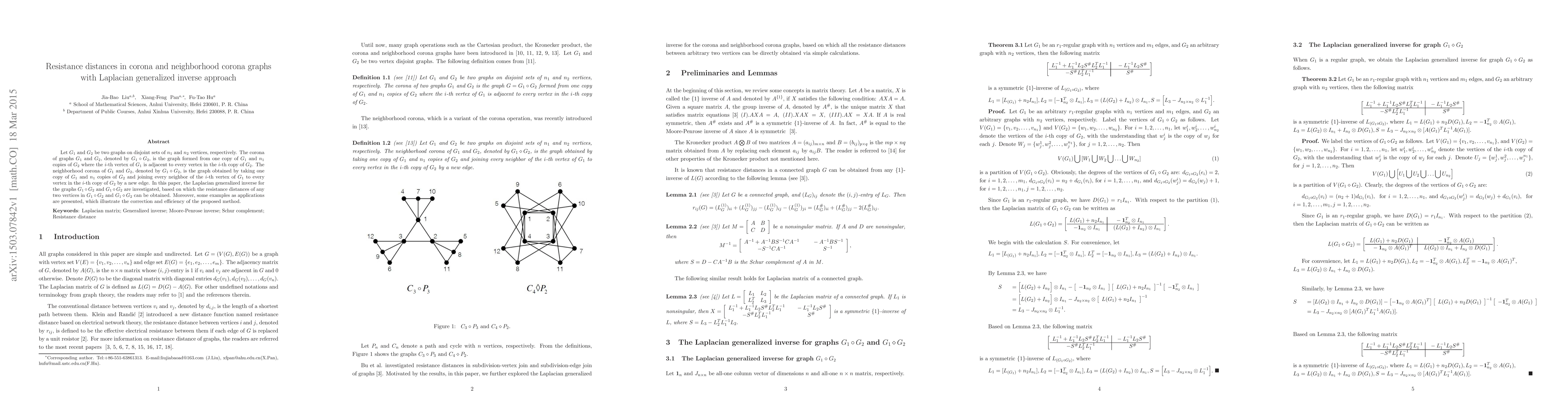 This paper investigates the Laplacian generalized inverse for corona and neighborhood corona graphs, enabling the calculation of resistance distances between any two vertices in these structures. Examples demonstrate the method's accuracy and effectiveness.