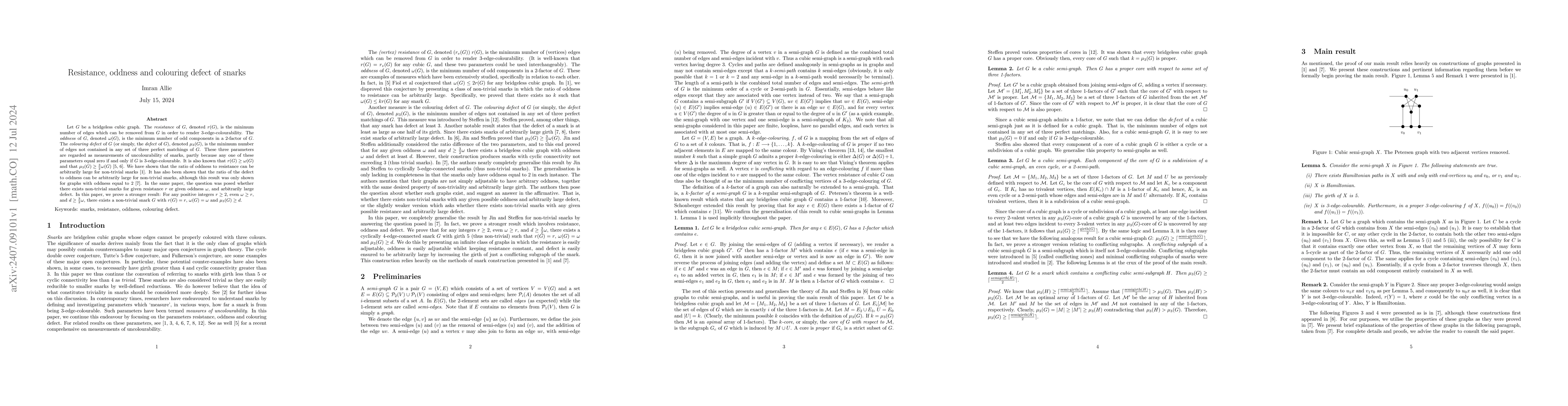 This paper investigates the relationship between resistance, oddness, and colouring defect in snarks, demonstrating that for any given positive integers $r \geq 2$, even $\omega \geq r$, and $d \geq \frac{3}{2}\omega$, there exists a non-trivial snark with specified resistance, oddness, and colouring defect values.