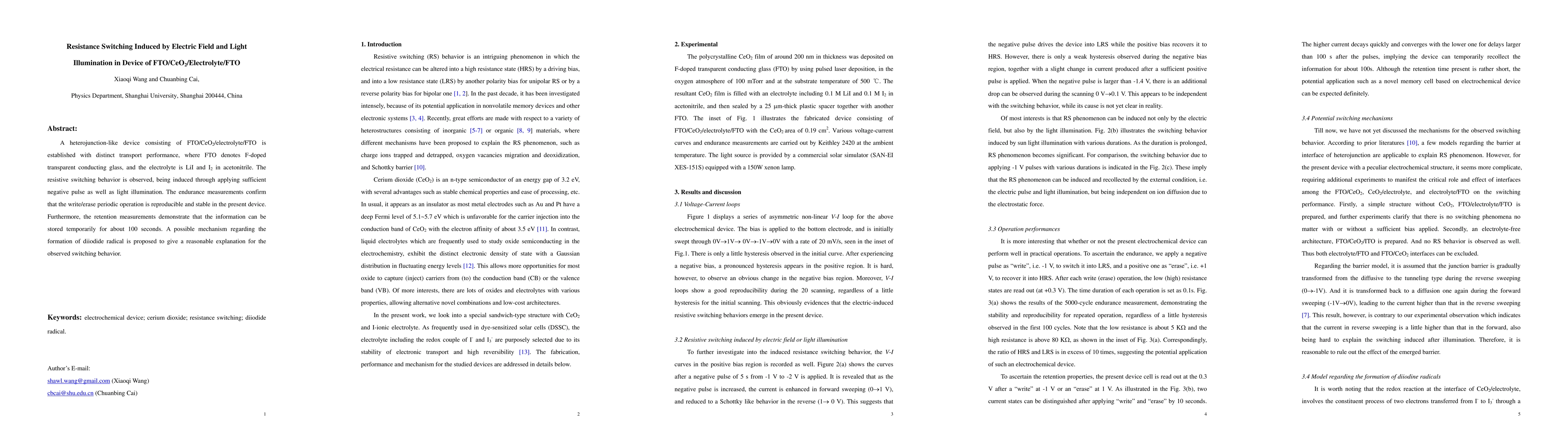 This paper investigates a heterojunction device with FTO/CeO2/electrolyte/FTO configuration, demonstrating resistive switching triggered by both electric field pulses and light illumination. The device exhibits stable and reproducible resistive switching behavior, with information retention for approximately 100 seconds.