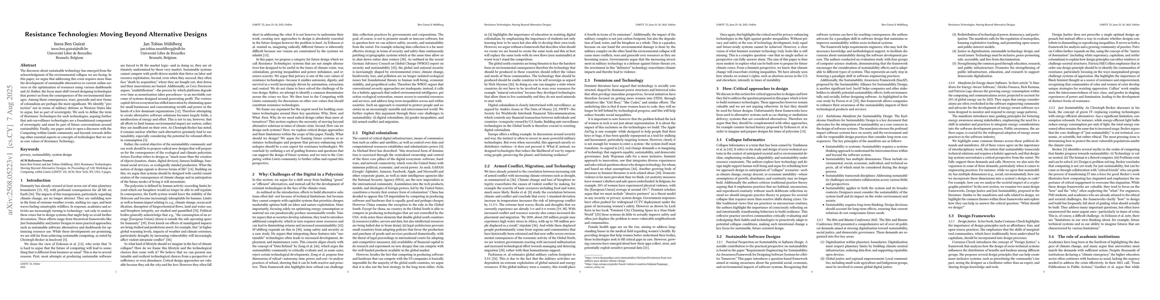 The discourse about sustainable technology has emerged from the acknowledgment of the environmental collapse we are facing. In this paper, we argue that addressing this crisis requires more than the development of sustainable alternatives to current online services or the optimization of resources using various dashboards and AI. Rather, the focus must shift toward designing technologies that protect us from the consequences of the environmental damages. Among these consequences, wars, genocide and new forms of colonialism are perhaps the most significant. We identify "protection" not in terms of military defense as Western States like to argue, but as part of sovereignty. We seek to define the term of "Resistance Technologies" for such technologies, arguing further that anti-surveillance technologies are a foundational component of sovereignty and must be part of future conversations around sustainability. Finally, our paper seeks to open a discourse with the Computing-within-Limits community and beyond, towards defining other essential aspects or concepts of technologies that we see as core values of "Resistance Technology".