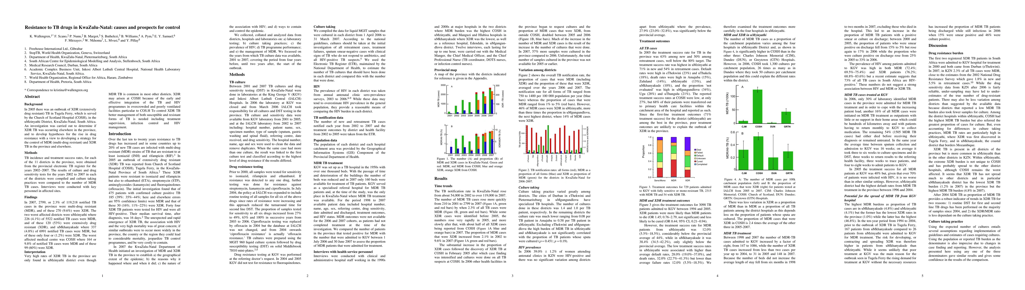 In 2005 there was an outbreak of XDR (extensively drug resistant) TB in Tugela Ferry, which is served by the Church of Scotland Hospital (COSH), in the uMzinyathi District, KwaZulu-Natal, South Africa. An investigation was carried out to determine if XDR TB was occurring elsewhere in the province, and to develop hypotheses for the rise in drug resistance with a view to developing a strategy for the control of MDR (multi-drug resistant) and XDR TB in the province and elsewhere. TB incidence and treatment success rates, for each of the 11 districts in the province, were obtained from the provincial electronic TB register for the years 2002-2007. The results of culture and drug sensitivity tests for the years 2002 to 2007 in each of the districts were compiled and culture taking practices were compared to the number of MDR TB cases. Interviews were conducted with key personnel in affected sites. In 2007, 2799, or 2.3% of 119,218 notified TB cases in the province were multi-drug resistant (MDR), and of these 270 (9.6%) were XDR. The two worst affected districts were uMzinyathi where 226 (4.1%) of 5522 notified TB cases were MDR, and of these 120 (53%) were extensively drug resistant (XDR), and uMkhanyakude where 337 (4.8%) of 6991 notified TB cases were MDR, but of these only four or (1.2%) were XDR. The worst affected medical centre was COSH where 164 or 9.8% of notified TB cases were MDR and of these 99 (60%) were XDR. Very high rates of XDR TB in the province are only found in uMzinyathi district even though MDR TB is common in most other districts. XDR may arisen at COSH because of the early and effective integration of the TB and HIV programmes in overcrowded and poorly ventilated facilities particular to COS.H To control XDR TB better management of both susceptible and resistant forms of TB is needed including treatment supervision, infection control and HIV management.