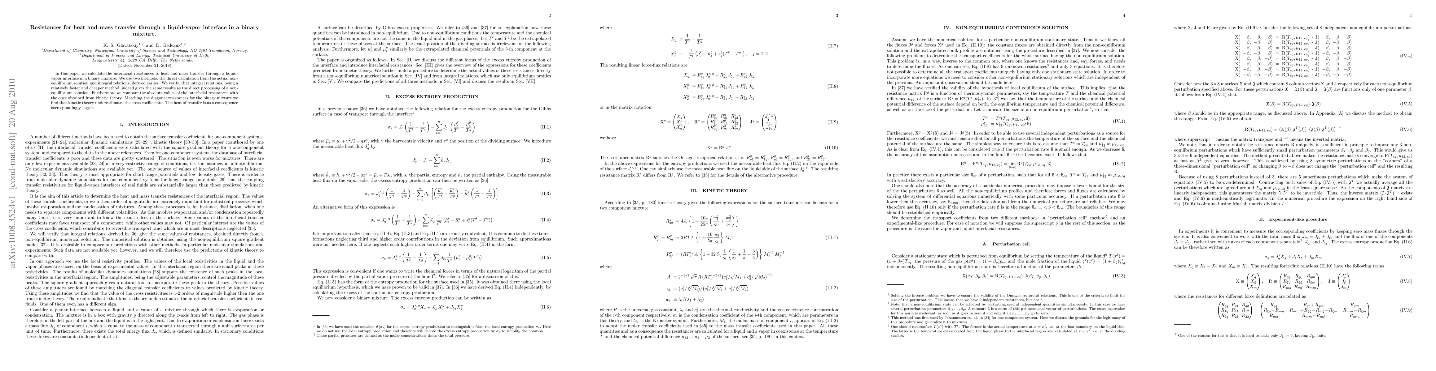 This paper calculates the interfacial resistances for heat and mass transfer in a binary mixture using both direct non-equilibrium solutions and integral relations, finding that integral relations provide accurate results at a lower cost. It also reveals that kinetic theory underestimates cross coefficients, leading to a higher heat of transfer.