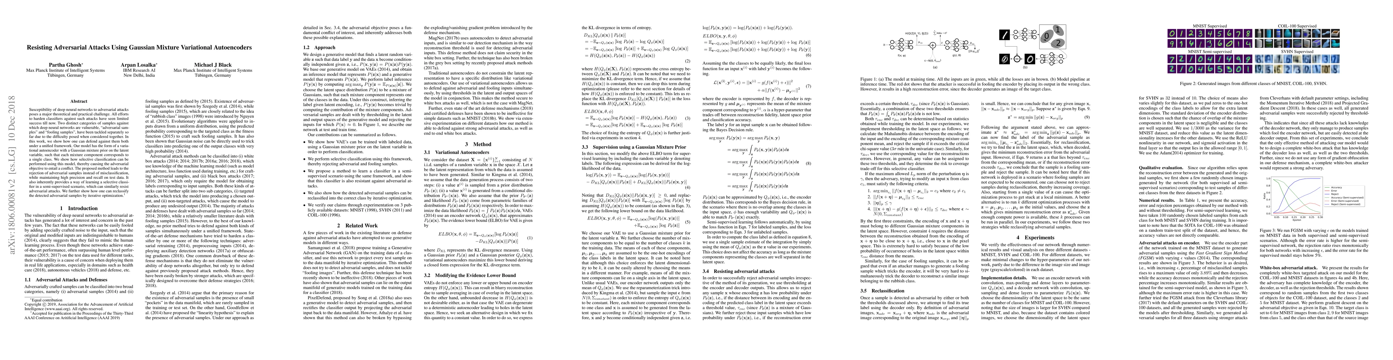 Susceptibility of deep neural networks to adversarial attacks poses a major theoretical and practical challenge. All efforts to harden classifiers against such attacks have seen limited success. Two distinct categories of samples to which deep networks are vulnerable, "adversarial samples" and "fooling samples", have been tackled separately so far due to the difficulty posed when considered together. In this work, we show how one can address them both under one unified framework. We tie a discriminative model with a generative model, rendering the adversarial objective to entail a conflict. Our model has the form of a variational autoencoder, with a Gaussian mixture prior on the latent vector. Each mixture component of the prior distribution corresponds to one of the classes in the data. This enables us to perform selective classification, leading to the rejection of adversarial samples instead of misclassification. Our method inherently provides a way of learning a selective classifier in a semi-supervised scenario as well, which can resist adversarial attacks. We also show how one can reclassify the rejected adversarial samples.