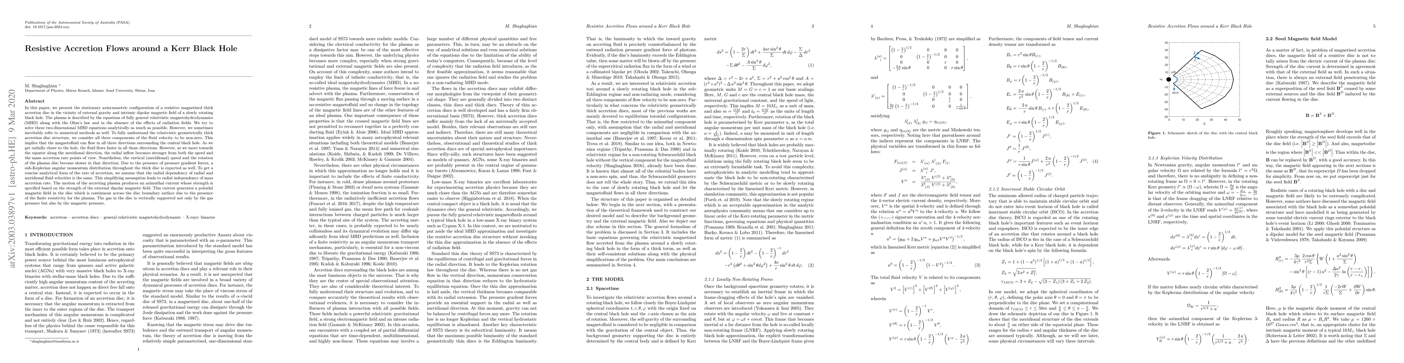 This paper investigates the stationary, axisymmetric resistive magnetohydrodynamic accretion flows around a slowly rotating Kerr black hole, focusing on the geometrically thick disc structure. Analytical and numerical methods are employed to explore the three-dimensional fluid dynamics, revealing a sub-Keplerian angular momentum distribution and a poloidal magnetic field generated by the azimuthal current in the plasma.