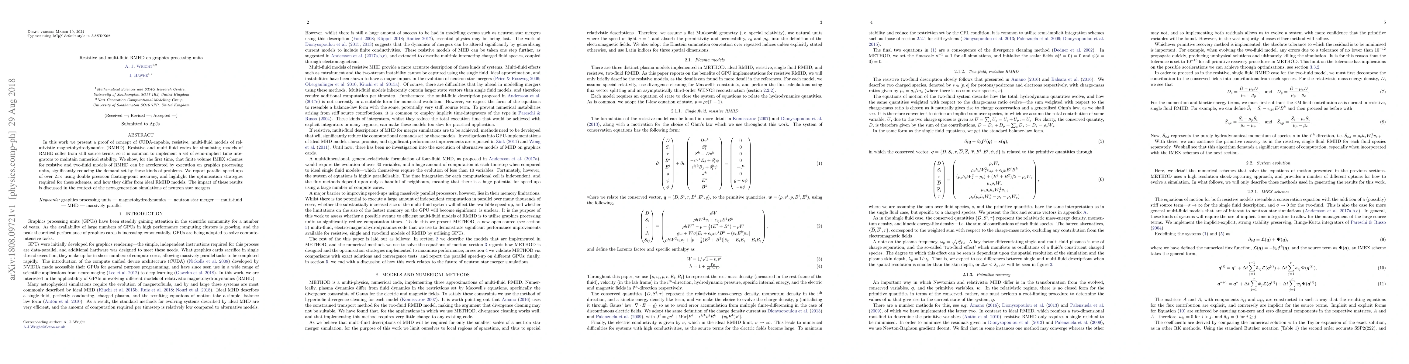 This paper demonstrates the first implementation of resistive and multi-fluid relativistic magnetohydrodynamics (RMHD) models on graphics processing units (GPUs) using CUDA, achieving over 21× speed-up compared to traditional methods. The study highlights optimization techniques for these finite volume IMEX schemes and discusses their implications for future simulations of neutron star mergers.