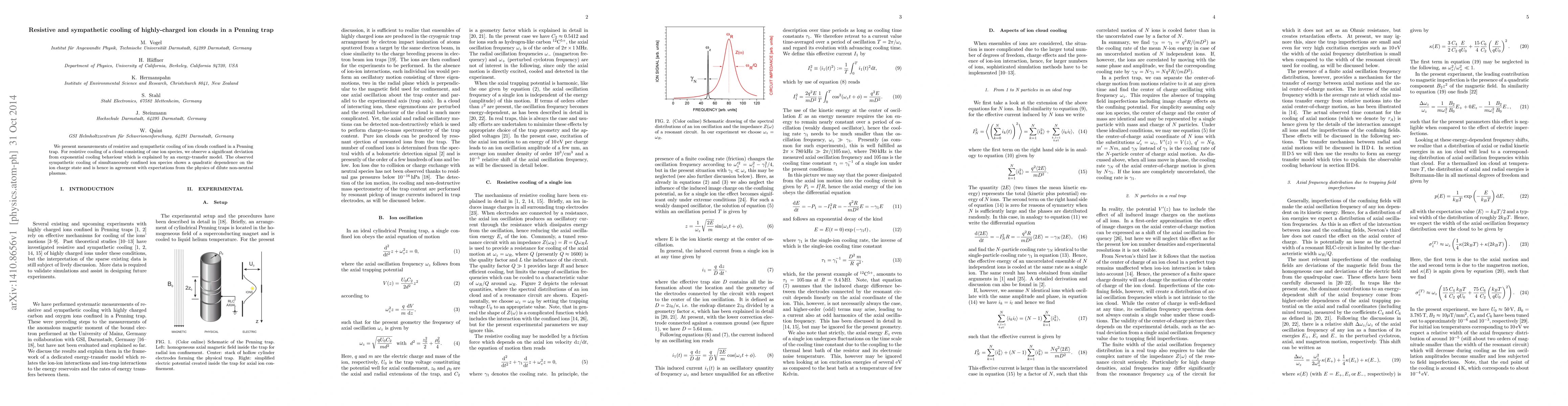 Summary: The paper investigates resistive and sympathetic cooling of ion clouds in a Penning trap, noting deviations in resistive cooling behavior explained by an energy-transfer model. Sympathetic cooling between different ion species is shown to depend quadratically on the ion charge state, aligning with theoretical predictions for dilute non-neutral plasmas.