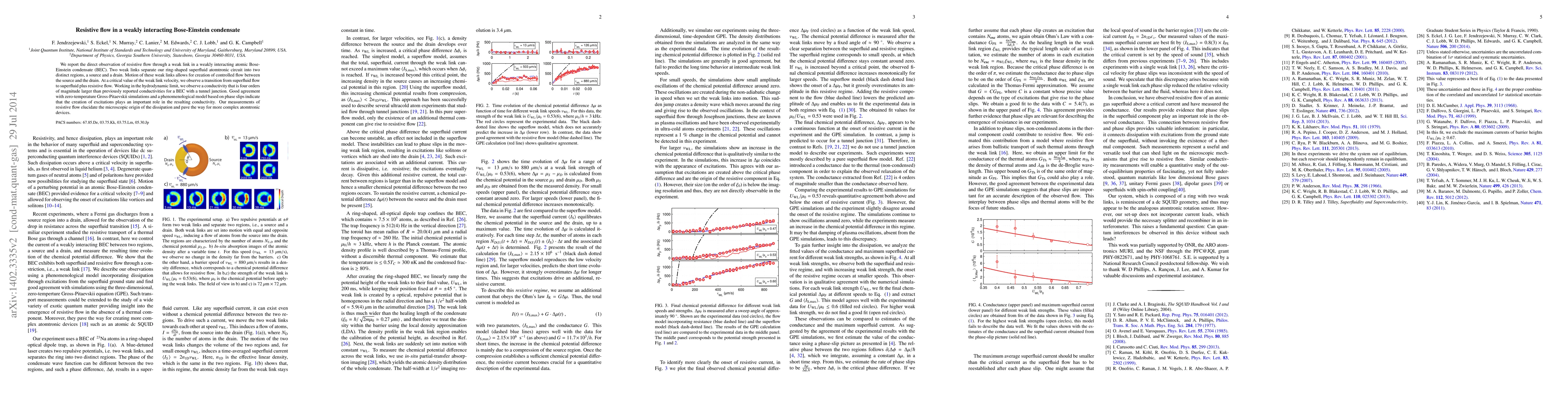 This paper reports the observation of resistive flow in a weakly interacting Bose-Einstein condensate through a weak link, revealing a transition from superfluid to resistive flow at a critical velocity. The study finds a conductivity 4 orders of magnitude higher than previously reported, supported by simulations and models indicating the role of excitation creation in the observed dissipation.