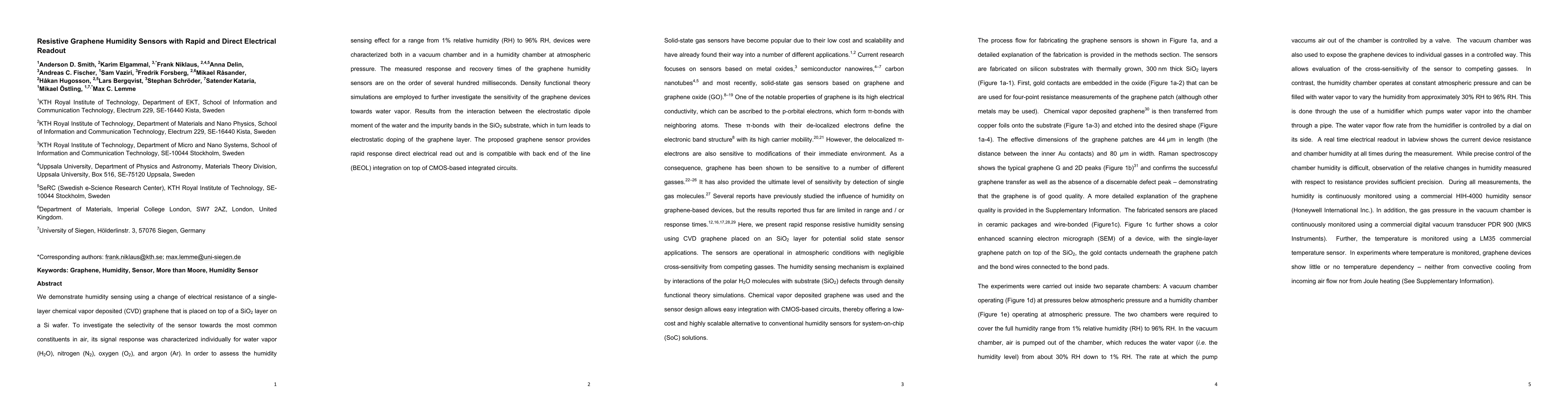 This paper presents a graphene-based humidity sensor that detects changes in electrical resistance due to water vapor exposure, demonstrating rapid response times and direct electrical readout. The sensor's selectivity and performance across a wide humidity range are validated through experiments and DFT simulations, highlighting its potential for integration with CMOS circuits.