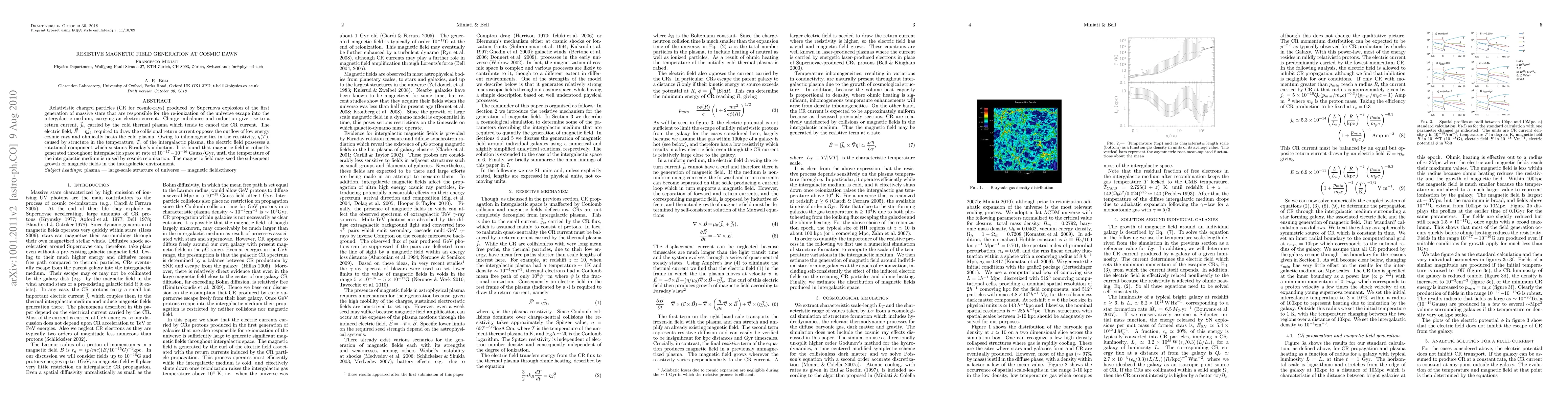 Relativistic charged particles (CR for cosmic-rays) produced by Supernova explosion of the first generation of massive stars that are responsible for the re-ionization of the universe escape into the intergalactic medium, carrying an electric current. Charge imbalance and induction give rise to a return current, $\vec j_t$, carried by the cold thermal plasma which tends to cancel the CR current. The electric field, $\vec E=\eta \vec j_t$, required to draw the collisional return current opposes the outflow of low energy cosmic rays and ohmically heats the cold plasma. Owing to inhomogeneities in the resistivity, $\eta(T)$, caused by structure in the temperature, $T$, of the intergalactic plasma, the electric field possesses a rotational component which sustains Faraday's induction. It is found that magnetic field is robustly generated throughout intergalactic space at rate of 10$^{-17}-10^{-16}$ Gauss/Gyr, until the temperature of the intergalactic medium is raised by cosmic reionization. The magnetic field may seed the subsequent growth of magnetic fields in the intergalactic environment.