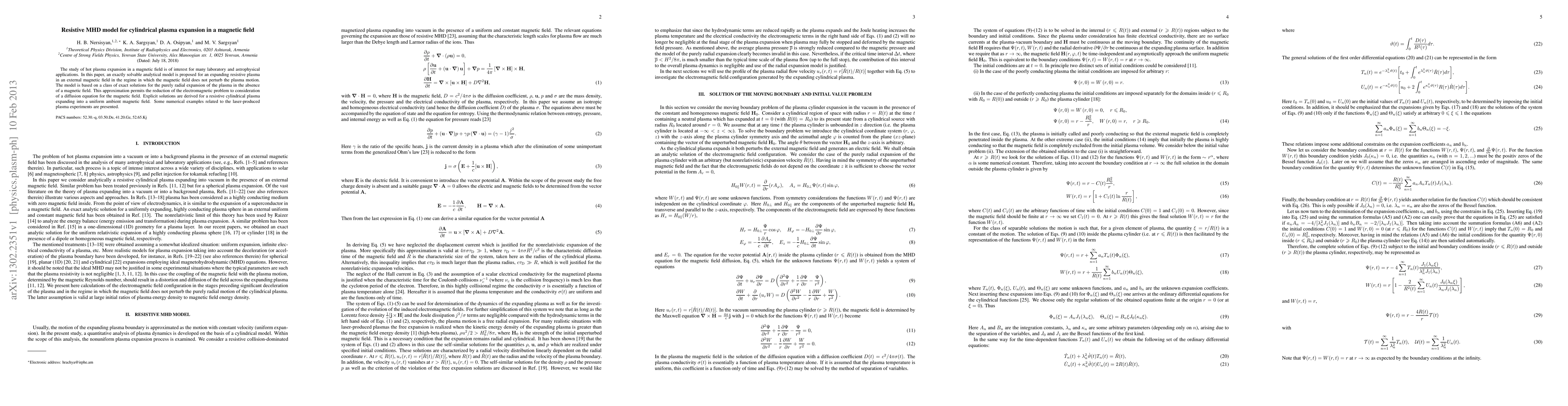 This paper proposes an analytical model for resistive magnetohydrodynamics (MHD) describing cylindrical plasma expansion in a uniform magnetic field, without magnetic field perturbation. The model simplifies the electromagnetic problem to a diffusion equation for the magnetic field, providing explicit solutions for laser-produced plasma experiments.