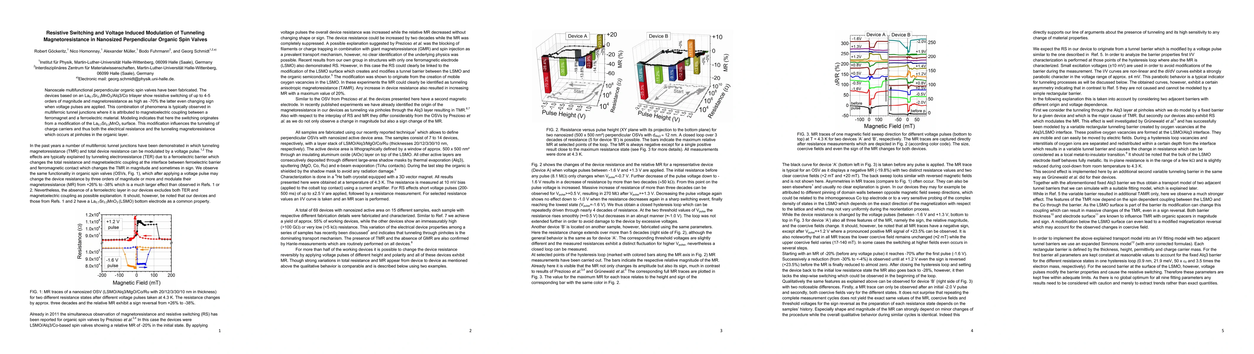 Nanoscale multifunctional perpendicular organic spin valves have been fabricated. The devices based on an La$_{0.7}$Sr$_{0.3}$MnO$_3$/Alq$_3$/Co trilayer show resistive switching of up to 4-5 orders of magnitude and magnetoresistance as high as -70% the latter even changing sign when voltage pulses are applied. This combination of phenomena is typically observed in multiferroic tunnel junctions where it is attributed to magnetoelectric coupling between a ferromagnet and a ferroelectric material. Modeling indicates that here the switching originates from a modification of the La$_{0.7}$Sr$_{0.3}$MnO$_3$ surface. This modification influences the tunneling of charge carriers and thus both the electrical resistance and the tunneling magnetoresistance which occurs at pinholes in the organic layer.