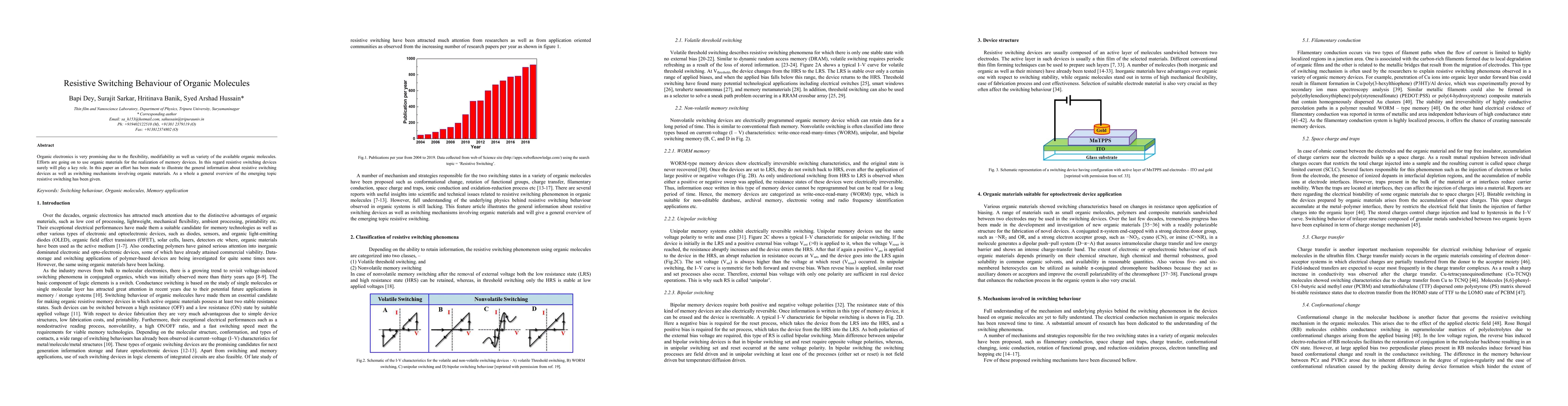 This paper explores resistive switching behavior in organic molecules, highlighting their potential for flexible memory devices. It provides a general overview of the technology, its mechanisms, and implications for emerging applications.
