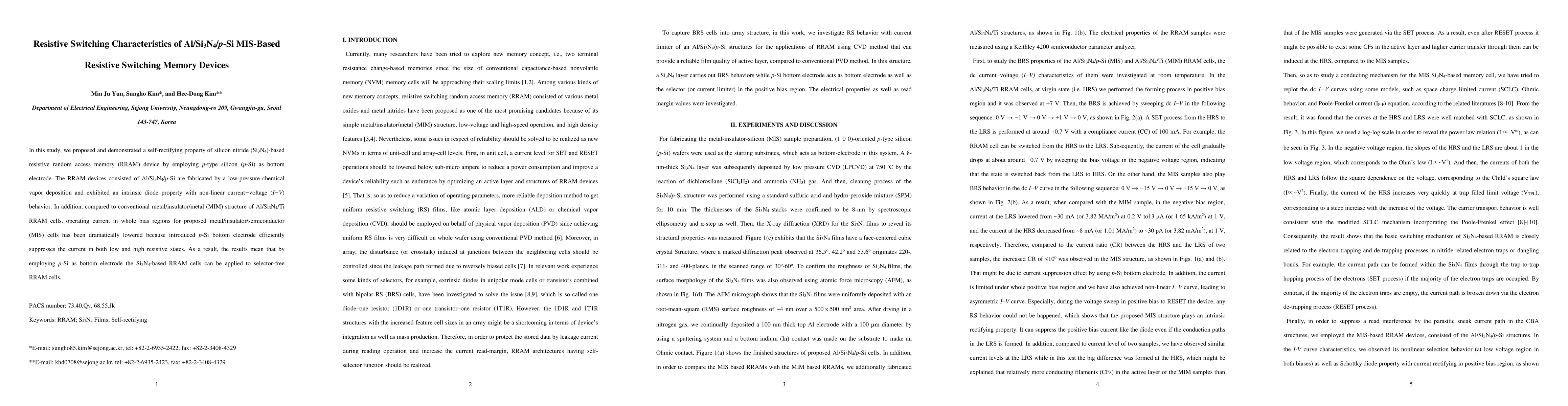 In this study, we proposed and demonstrated a self-rectifying property of silicon nitride (Si3N4)-based resistive random access memory device by employing p-type silicon (p-Si) as bottom electrode. The RRAM devices consisted of Al/Si3N4/p-Si are fabricated by a low presure chemical vapor deposition and exhibited an intrinsic diode property with non-linear current-voltage (I-V) behavior. In addition, compared to conventional metal/insulator/metal (MIM) structure of Al/Si3N4/Ti RRAM cells, operating current in whole bias regions for proposed metal/insulator/semiconductor (MIS) cells has been dramatically lowered because introduced p-Si bottom electrode efficiently suppresses the current in both low and high resistive states. As a result, the results mean that by employing p-Si as bottom electrode the Si3N4-based RRAM cells can be applied to selector-free RRAM cells.