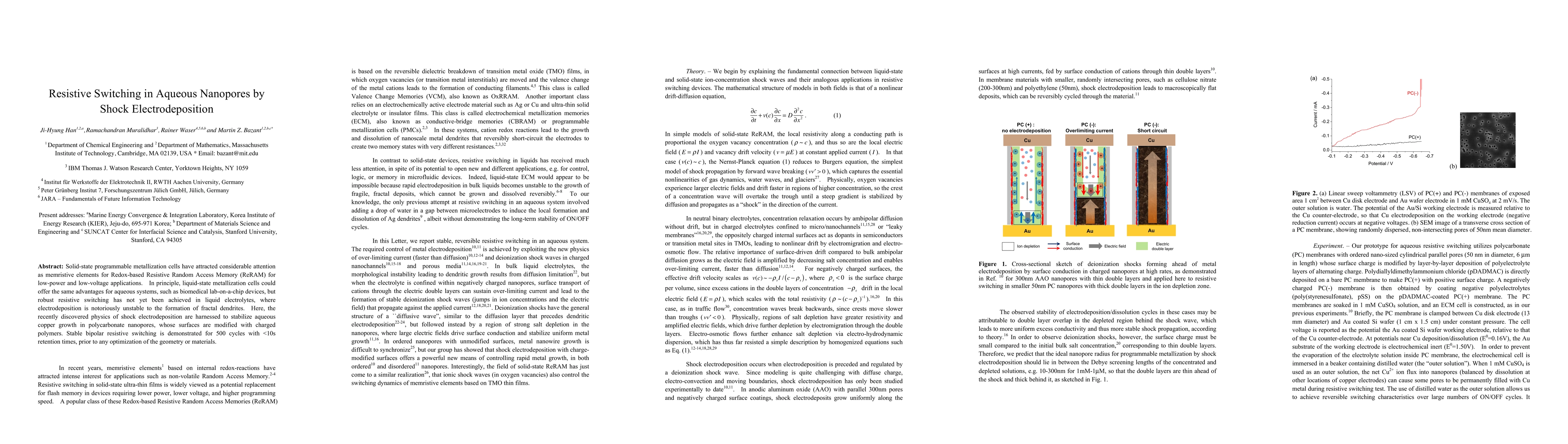 This paper explores the use of shock electrodeposition to achieve stable resistive switching in aqueous nanopores, demonstrating robust bipolar resistive switching in modified polycarbonate nanopores filled with copper. The approach shows promise for low-power, low-voltage applications in biomedical devices.