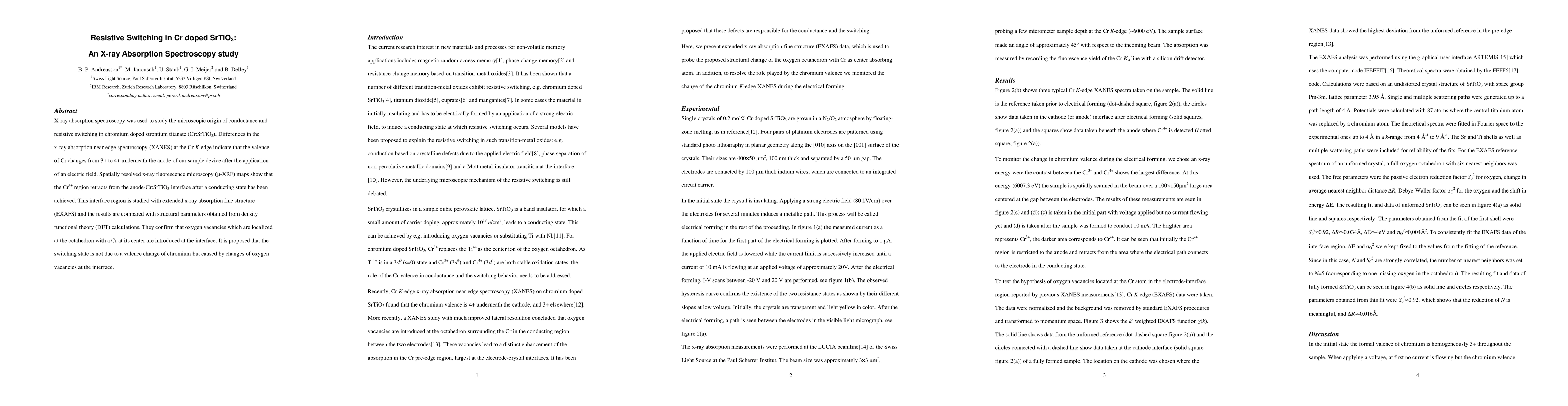 This study uses X-ray absorption spectroscopy to investigate resistive switching in Cr-doped SrTiO3, revealing that Cr valence changes from 3+ to 4+ under the anode after electric field application. The Cr4+ region retracts post-switching, suggesting oxygen vacancies at the Cr-centered octahedron interface cause the resistive switching.