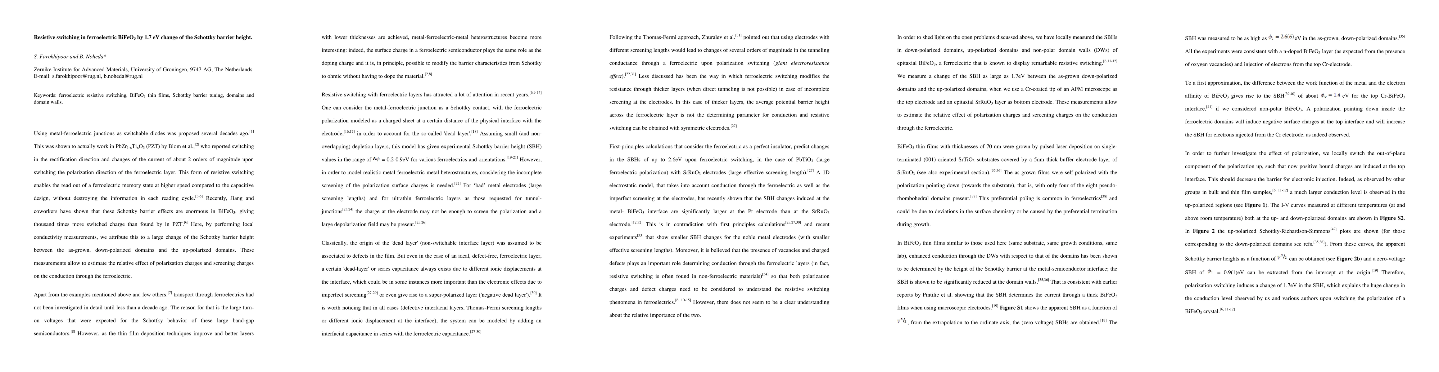 This paper investigates resistive switching in BiFeO3 ferroelectrics, attributing the phenomenon to a 1.7 eV change in Schottky barrier height between down- and up-polarized domains, which enhances the switching charge by a factor of a thousand compared to PbZr(1-x)TixO3 (PZT). Local conductivity measurements reveal the impact of polarization and screening charges on conduction through the ferroelectric.