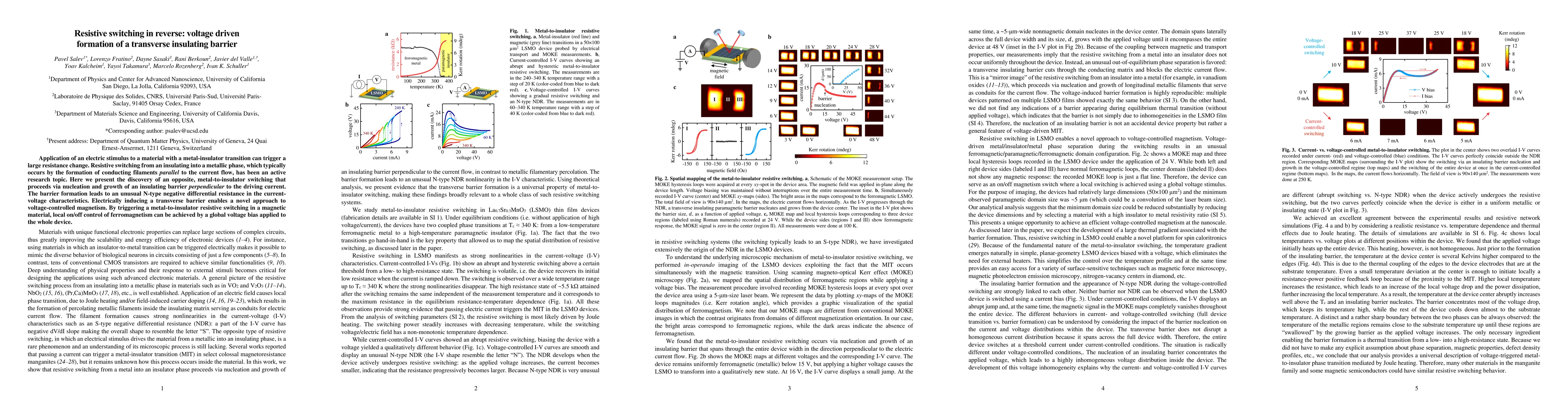 This paper reports the discovery of a reverse resistive switching mechanism where an electric stimulus induces a metal-to-insulator transition by forming a transverse insulating barrier perpendicular to the current flow, resulting in negative differential resistance and enabling voltage-controlled magnetism in magnetic materials.