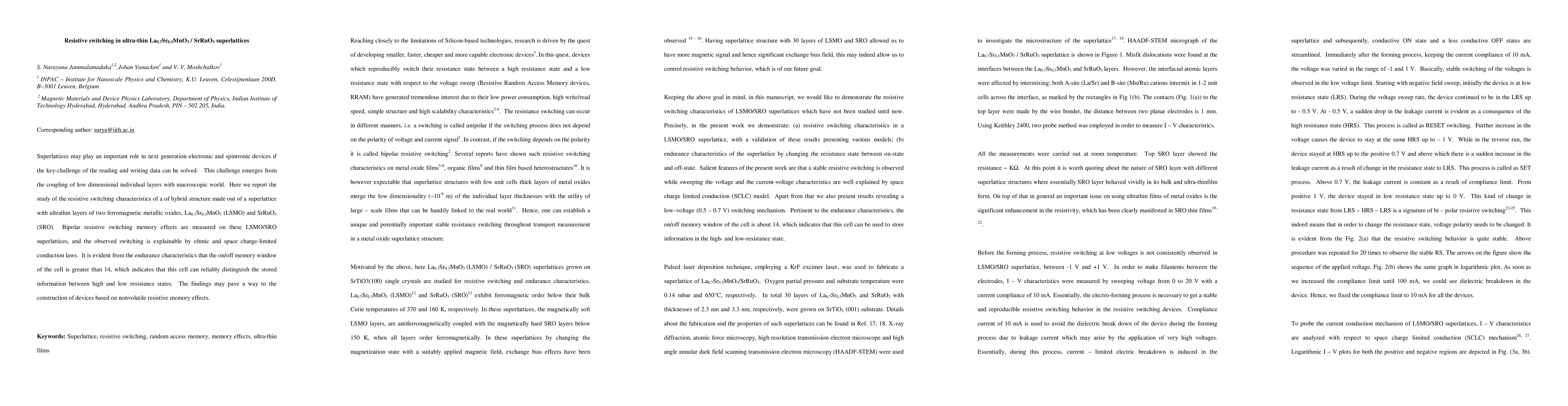 This study investigates the resistive switching behavior in ultra-thin LSMO/SRO superlattices, revealing bipolar resistive switching memory effects that are explained by ohmic and space charge-limited conduction. The demonstrated endurance with an on/off memory window greater than 14 suggests promising potential for nonvolatile resistive memory devices.