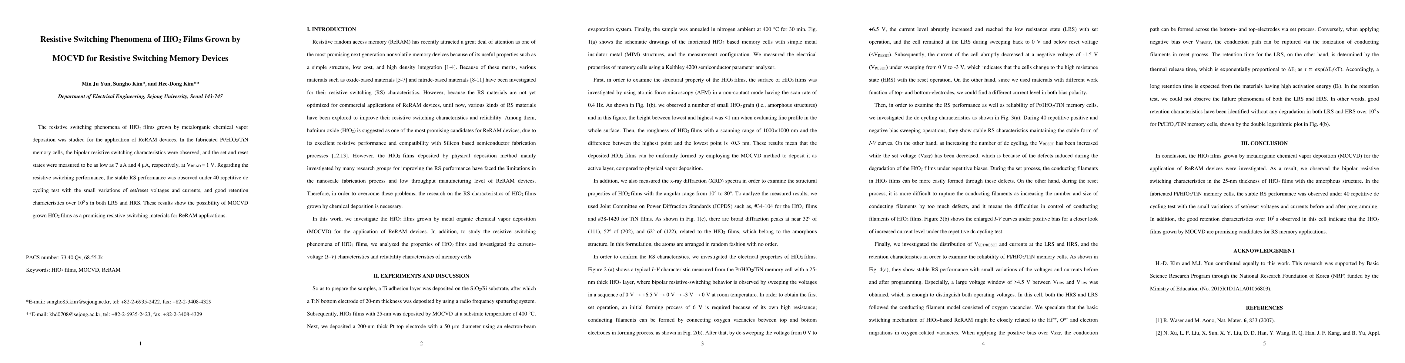 This study investigates the resistive switching behavior of HfO2 films deposited via metalorganic chemical vapor deposition for use in ReRAM devices, showing stable bipolar switching and good retention over extended cycling tests, indicating their potential for resistive memory applications.