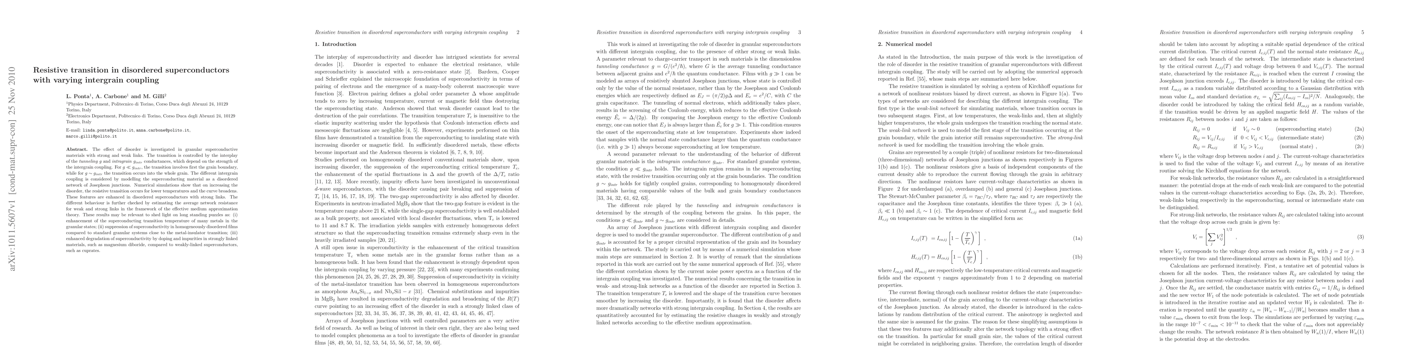This paper investigates the resistive transition in disordered superconductors with varying intergrain coupling, showing that the transition behavior depends on the balance between tunneling and intragrain conductances. Numerical simulations reveal that increased disorder leads to lower transition temperatures and broader resistive transitions, with stronger effects in materials with strong intergrain links.