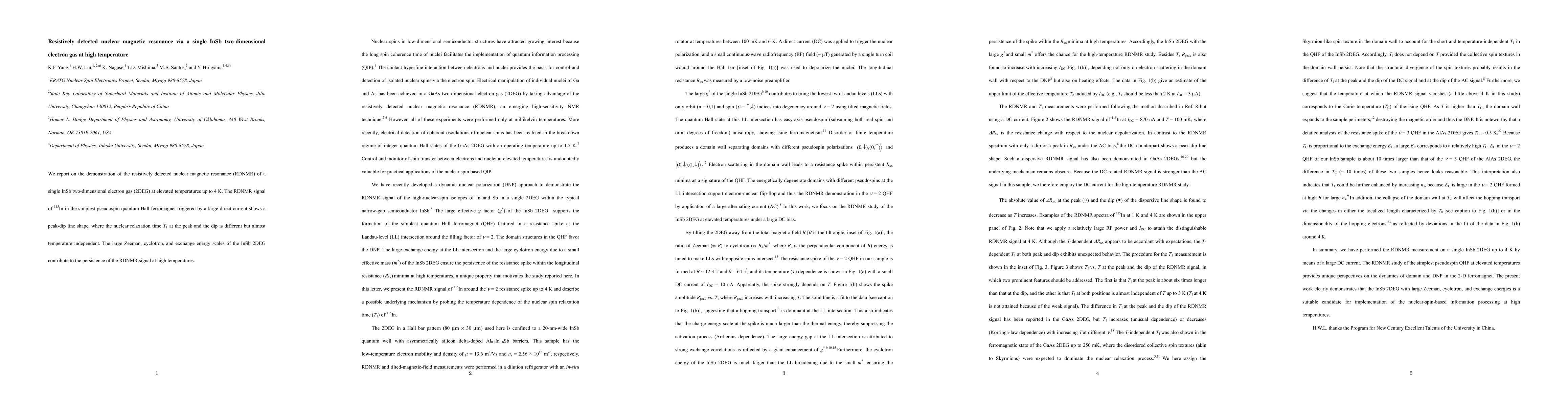 This paper demonstrates resistively detected nuclear magnetic resonance (RDNMR) in a single InSb two-dimensional electron gas (2DEG) at temperatures up to 4 K, showing distinct peak-dip line shapes with temperature-independent nuclear relaxation times. The RDNMR signal persists due to large Zeeman, cyclotron, and exchange energy scales in the InSb 2DEG.