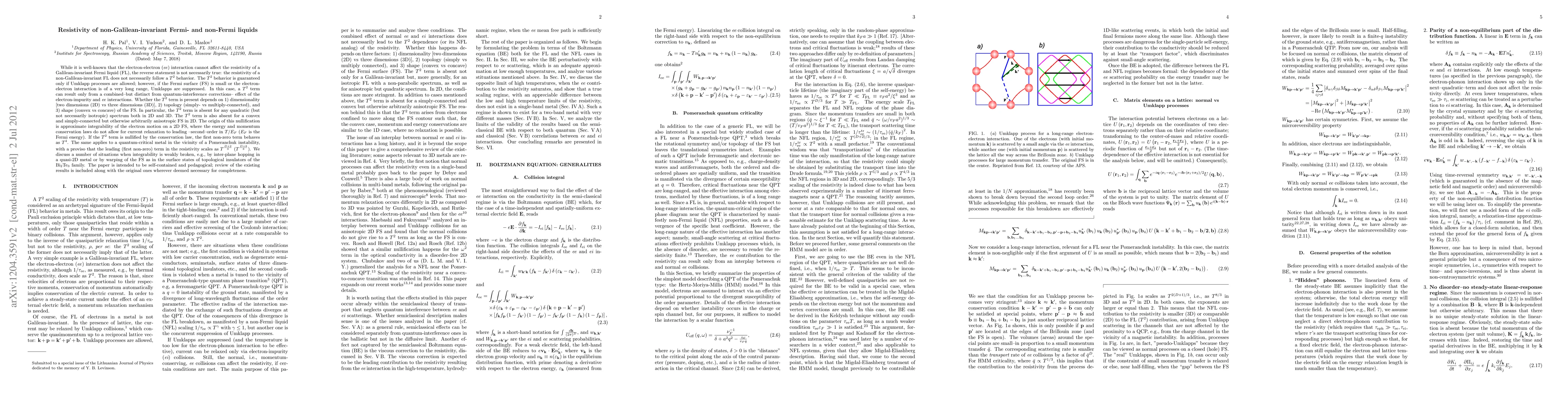 This paper explores the resistivity behavior in non-Galilean-invariant Fermi liquids, revealing that the T^2 term is not universally applicable. It finds that the presence of a T^2 term depends on factors such as dimensionality, topology, and shape of the Fermi surface, and is nullified in certain integrable systems where conservation laws prevent current relaxation.