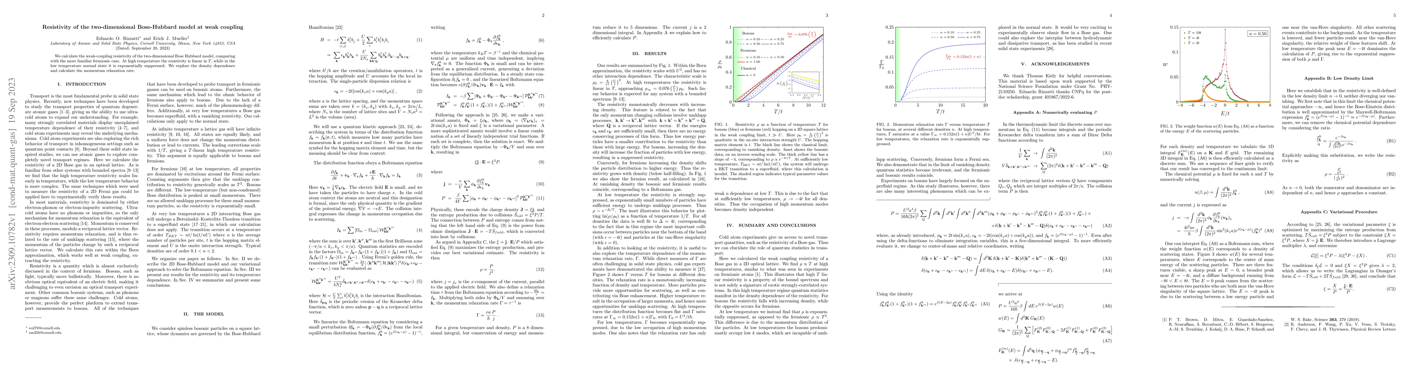 Summary: This study investigates the resistivity of the two-dimensional Bose-Hubbard model at weak coupling, revealing a linear $T$ dependence at high temperatures and exponential suppression at low temperatures, contrasting with fermionic behavior, and examines its density dependence and momentum relaxation rate.