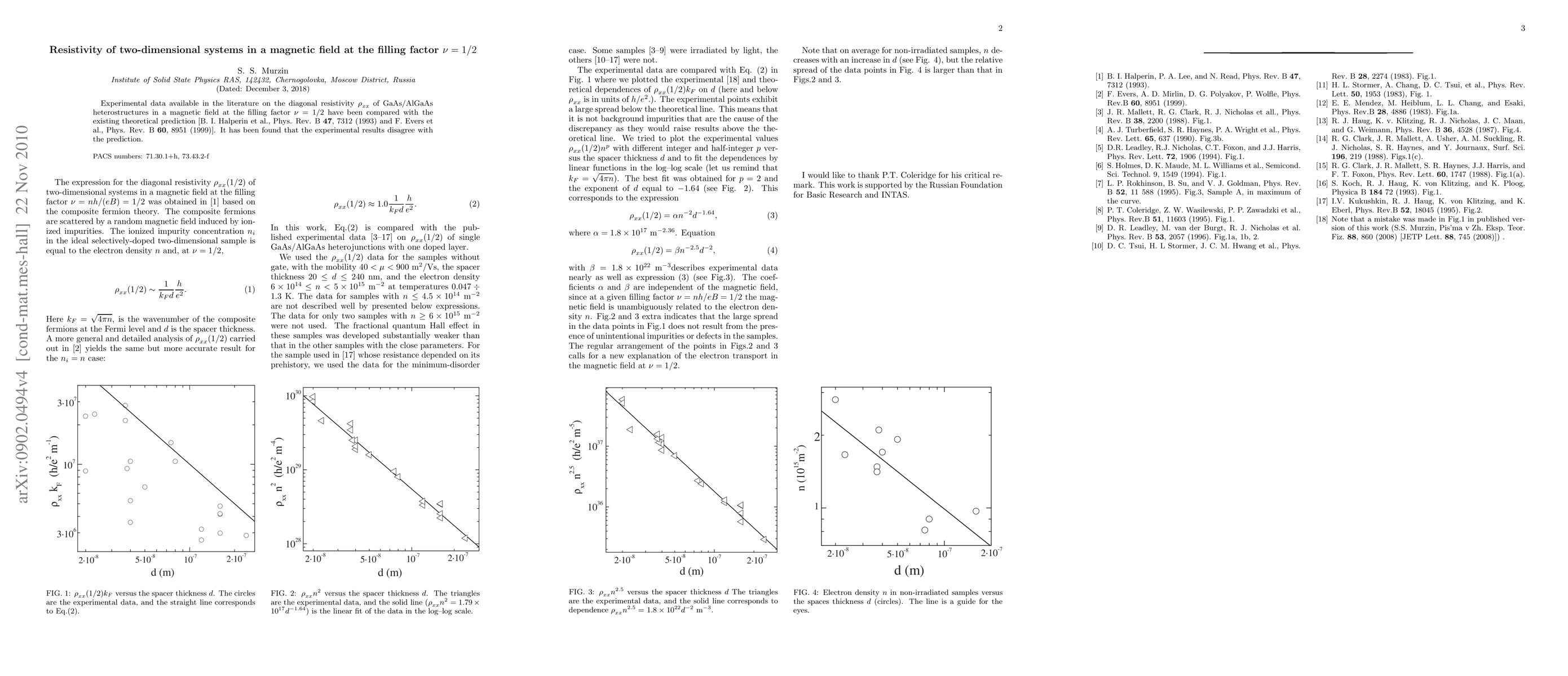 Experimental data on GaAs/AlGaAs heterostructures in a magnetic field at 1/2 filling factor disagrees with existing theoretical predictions for diagonal resistivity. The findings highlight discrepancies between theoretical models and experimental results in this specific research area.