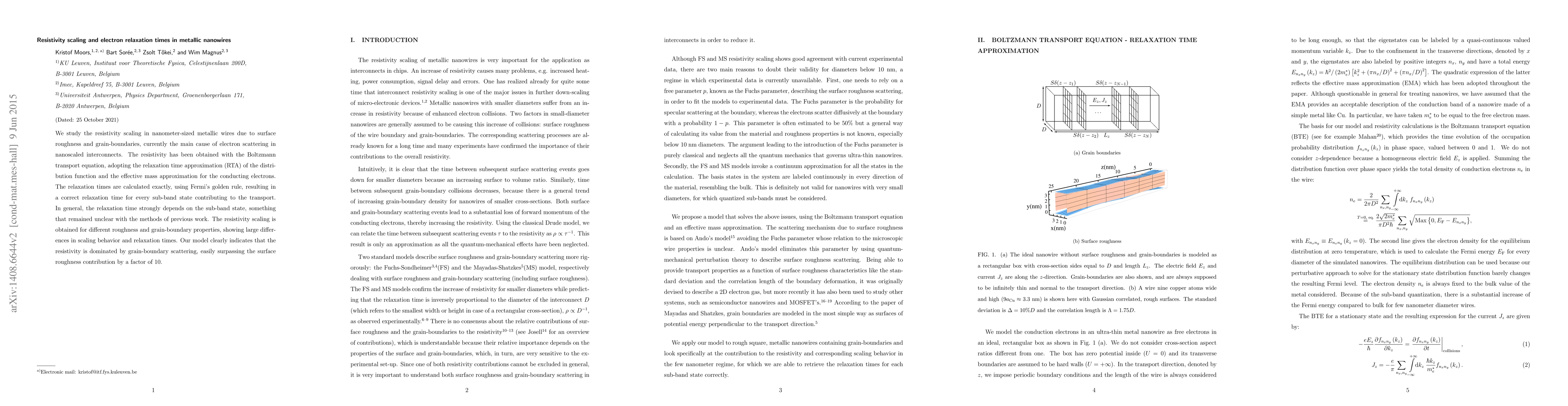 We study the resistivity scaling in nanometer-sized metallic wires due to surface roughness and grain-boundaries, currently the main cause of electron scattering in nanoscaled interconnects. The resistivity has been obtained with the Boltzmann transport equation, adopting the relaxation time approximation (RTA) of the distribution function and the effective mass approximation for the conducting electrons. The relaxation times are calculated exactly, using Fermi's golden rule, resulting in a correct relaxation time for every sub-band state contributing to the transport. In general, the relaxation time strongly depends on the sub-band state, something that remained unclear with the methods of previous work. The resistivity scaling is obtained for different roughness and grain-boundary properties, showing large differences in scaling behavior and relaxation times. Our model clearly indicates that the resistivity is dominated by grain-boundary scattering, easily surpassing the surface roughness contribution by a factor of 10.