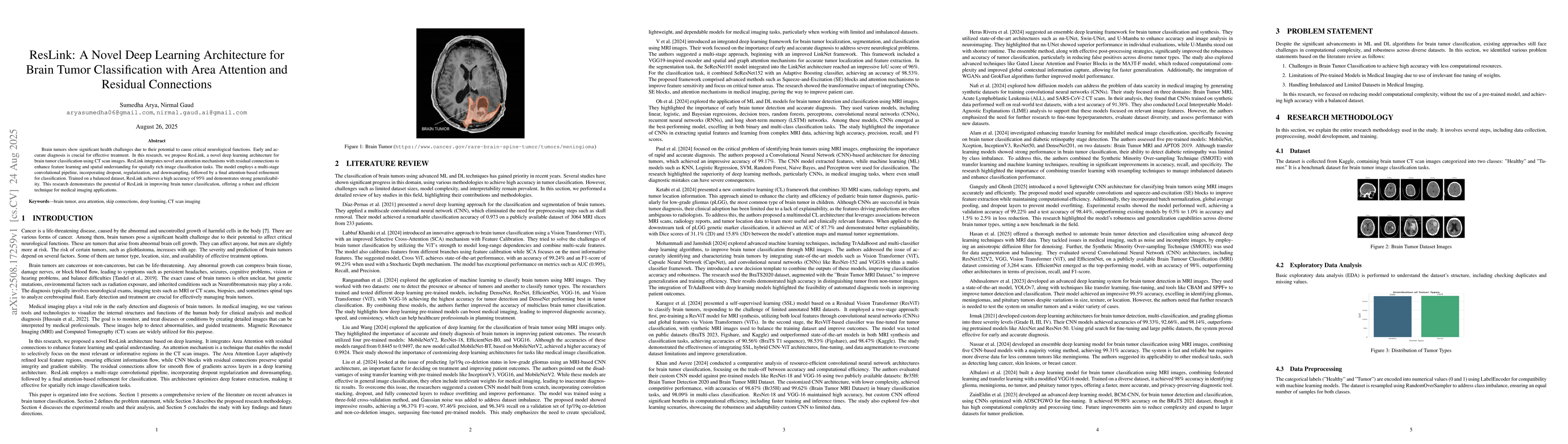 Brain tumors show significant health challenges due to their potential to cause critical neurological functions. Early and accurate diagnosis is crucial for effective treatment. In this research, we propose ResLink, a novel deep learning architecture for brain tumor classification using CT scan images. ResLink integrates novel area attention mechanisms with residual connections to enhance feature learning and spatial understanding for spatially rich image classification tasks. The model employs a multi-stage convolutional pipeline, incorporating dropout, regularization, and downsampling, followed by a final attention-based refinement for classification. Trained on a balanced dataset, ResLink achieves a high accuracy of 95% and demonstrates strong generalizability. This research demonstrates the potential of ResLink in improving brain tumor classification, offering a robust and efficient technique for medical imaging applications.