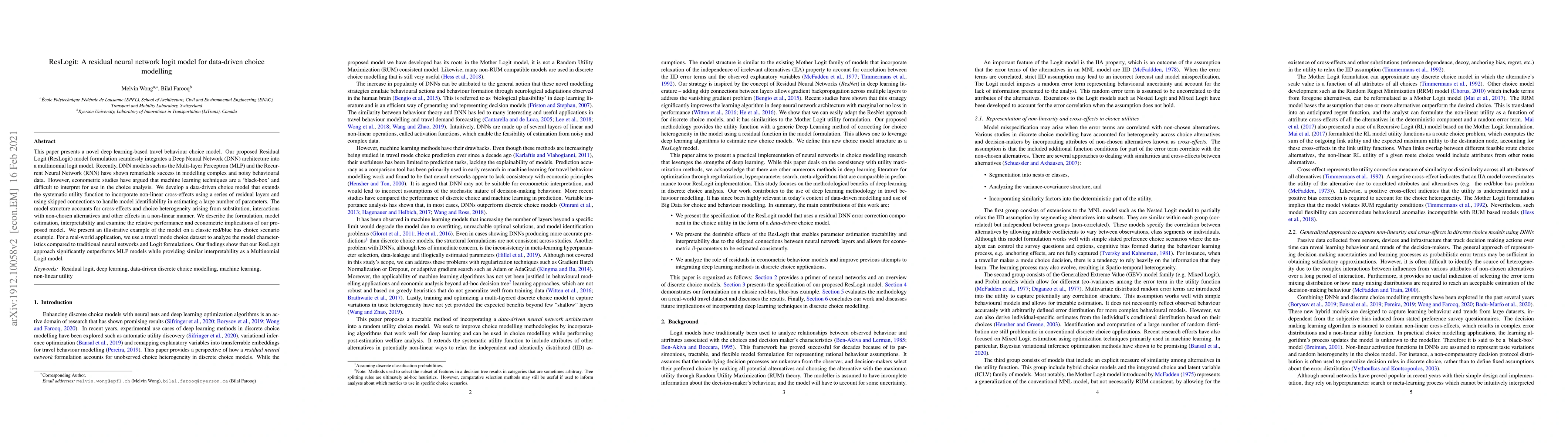 This paper introduces the Residual Logit (ResLogit) model, a hybrid deep learning approach that integrates a Deep Neural Network into a multinomial logit framework to model travel behaviour choices. The model demonstrates superior performance compared to traditional Multi-layer Perceptron models while maintaining interpretability akin to a Multinomial Logit model.