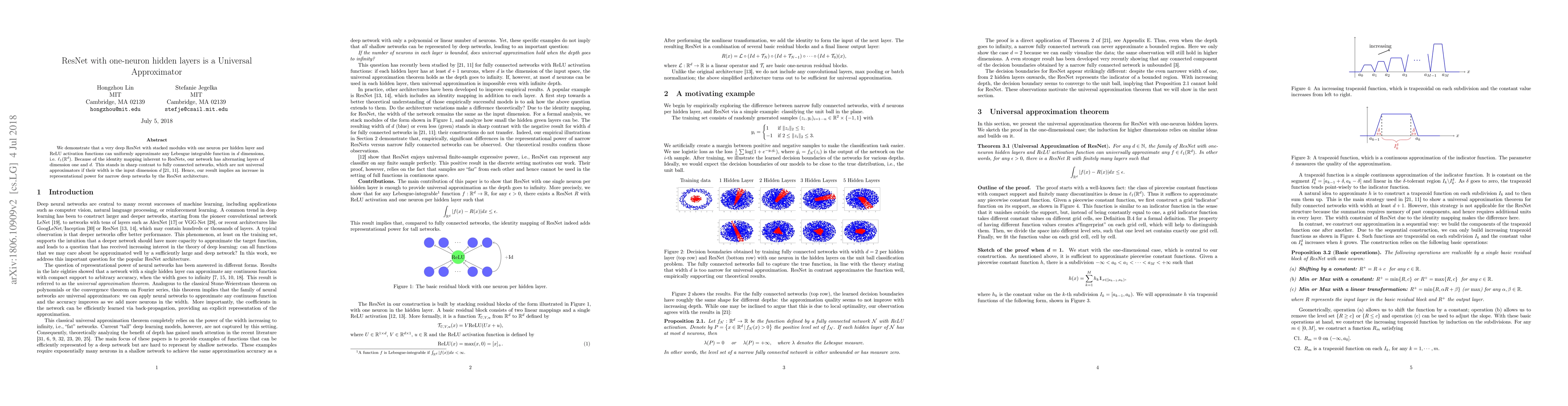 This paper shows that a deep ResNet with one-neuron hidden layers can uniformly approximate any Lebesgue integrable function, demonstrating the representational power of ResNet architectures compared to fully connected networks. This contrasts with previous findings that fully connected networks fail as universal approximators when their width equals the input dimension.
