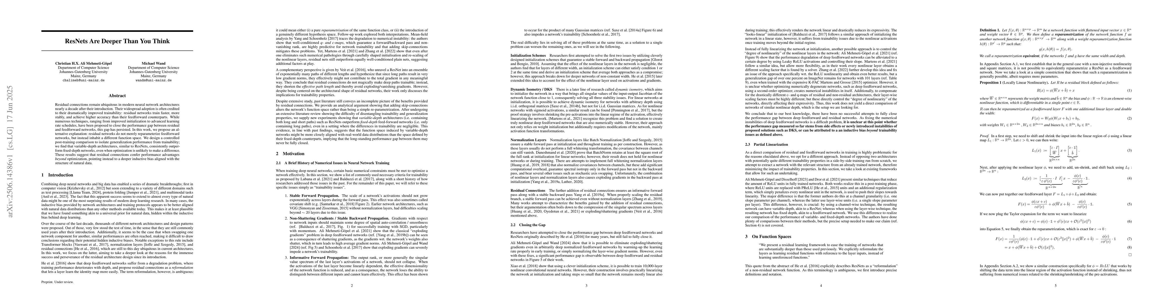 Residual connections remain ubiquitous in modern neural network architectures nearly a decade after their introduction. Their widespread adoption is often credited to their dramatically improved trainability: residual networks train faster, more stably, and achieve higher accuracy than their feedforward counterparts. While numerous techniques, ranging from improved initialization to advanced learning rate schedules, have been proposed to close the performance gap between residual and feedforward networks, this gap has persisted. In this work, we propose an alternative explanation: residual networks do not merely reparameterize feedforward networks, but instead inhabit a different function space. We design a controlled post-training comparison to isolate generalization performance from trainability; we find that variable-depth architectures, similar to ResNets, consistently outperform fixed-depth networks, even when optimization is unlikely to make a difference. These results suggest that residual connections confer performance advantages beyond optimization, pointing instead to a deeper inductive bias aligned with the structure of natural data.
