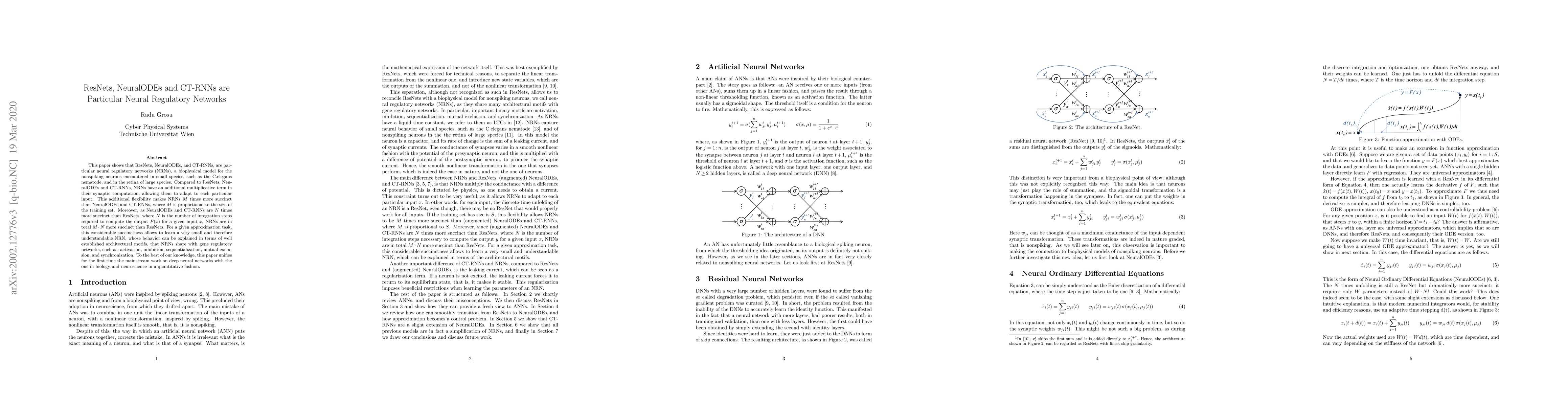 This paper shows that ResNets, NeuralODEs, and CT-RNNs, are particular neural regulatory networks (NRNs), a biophysical model for the nonspiking neurons encountered in small species, such as the C.elegans nematode, and in the retina of large species. Compared to ResNets, NeuralODEs and CT-RNNs, NRNs have an additional multiplicative term in their synaptic computation, allowing them to adapt to each particular input. This additional flexibility makes NRNs $M$ times more succinct than NeuralODEs and CT-RNNs, where $M$ is proportional to the size of the training set. Moreover, as NeuralODEs and CT-RNNs are $N$ times more succinct than ResNets, where $N$ is the number of integration steps required to compute the output $F(x)$ for a given input $x$, NRNs are in total $M\,{\cdot}\,N$ more succinct than ResNets. For a given approximation task, this considerable succinctness allows to learn a very small and therefore understandable NRN, whose behavior can be explained in terms of well established architectural motifs, that NRNs share with gene regulatory networks, such as, activation, inhibition, sequentialization, mutual exclusion, and synchronization. To the best of our knowledge, this paper unifies for the first time the mainstream work on deep neural networks with the one in biology and neuroscience in a quantitative fashion.