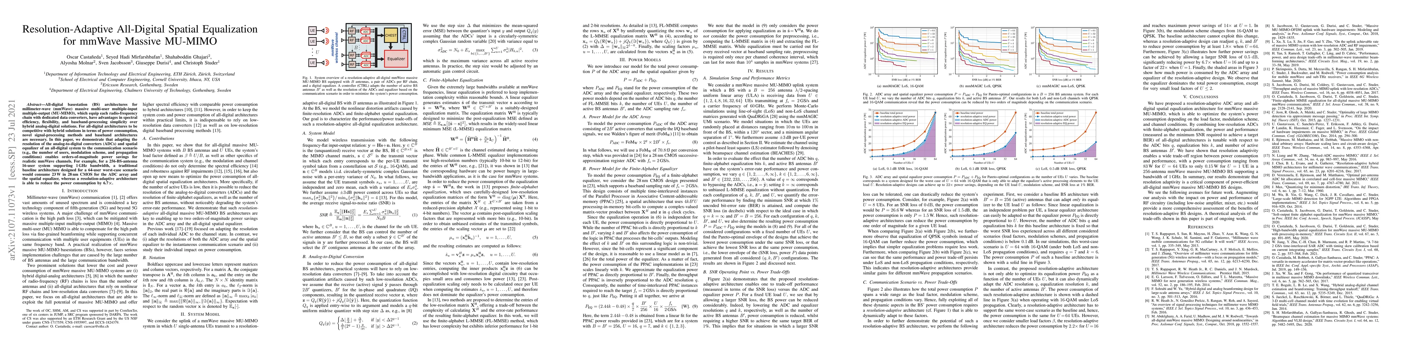 This paper proposes a resolution-adaptive all-digital spatial equalization technique for mmWave massive MU-MIMO systems, demonstrating significant power savings by dynamically adjusting the resolution of ADCs and equalizers based on the communication scenario, achieving up to 6.7x reduction compared to traditional fixed-resolution architectures.