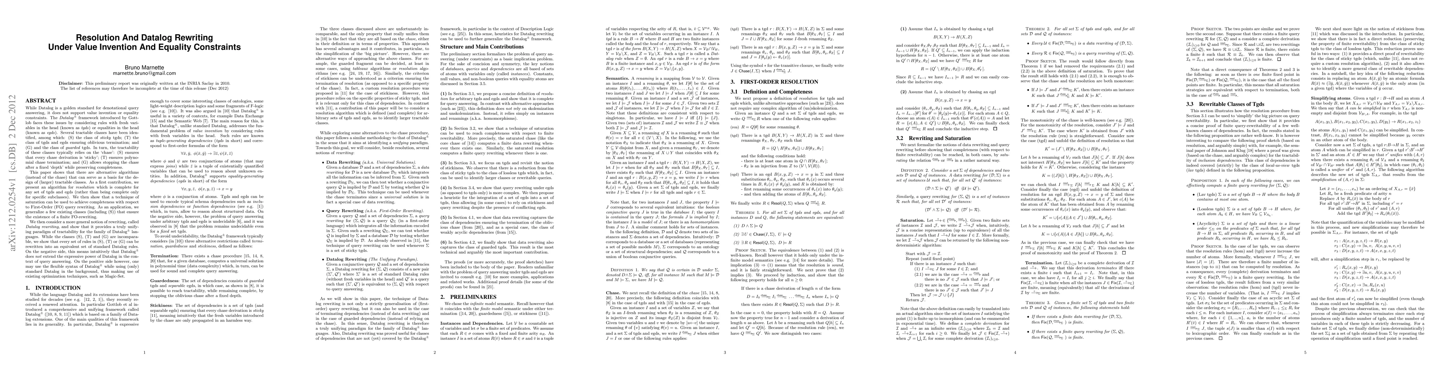 This paper refines the Datalog +/- framework with a complete resolution algorithm and saturation technique for First-Order query rewriting, showing guarded tgds can be rewritten into standard Datalog rules, maintaining Datalog +/-'s expressive power while allowing application of existing optimizations.