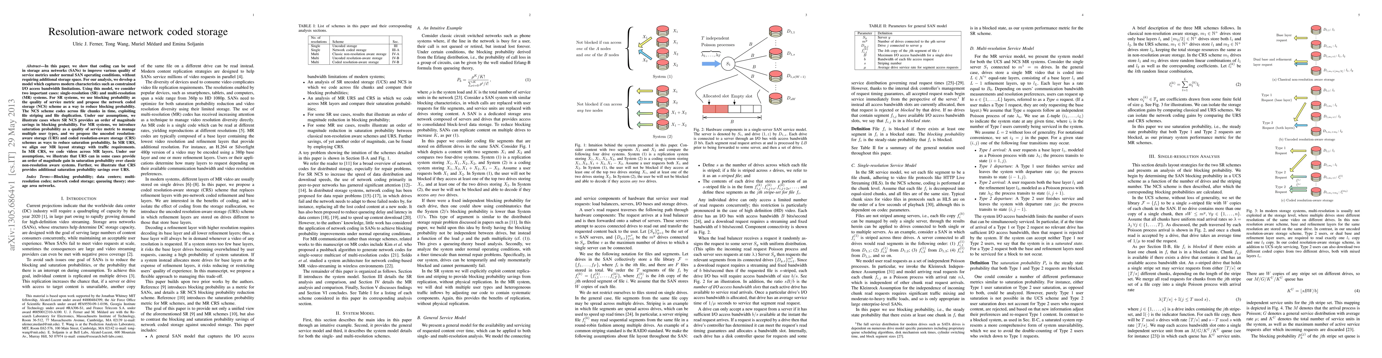 In this paper, we show that coding can be used in storage area networks (SANs) to improve various quality of service metrics under normal SAN operating conditions, without requiring additional storage space. For our analysis, we develop a model which captures modern characteristics such as constrained I/O access bandwidth limitations. Using this model, we consider two important cases: single-resolution (SR) and multi-resolution (MR) systems. For SR systems, we use blocking probability as the quality of service metric and propose the network coded storage (NCS) scheme as a way to reduce blocking probability. The NCS scheme codes across file chunks in time, exploiting file striping and file duplication. Under our assumptions, we illustrate cases where SR NCS provides an order of magnitude savings in blocking probability. For MR systems, we introduce saturation probability as a quality of service metric to manage multiple user types, and we propose the uncoded resolution- aware storage (URS) and coded resolution-aware storage (CRS) schemes as ways to reduce saturation probability. In MR URS, we align our MR layout strategy with traffic requirements. In MR CRS, we code videos across MR layers. Under our assumptions, we illustrate that URS can in some cases provide an order of magnitude gain in saturation probability over classic non-resolution aware systems. Further, we illustrate that CRS provides additional saturation probability savings over URS.