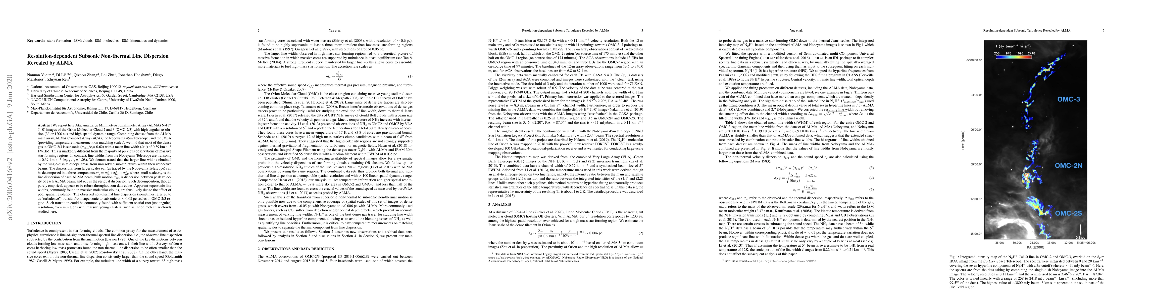 We report here Atacama Large Millimeter/submillimeter Array (ALMA) N$_2$H$^+$ (1-0) images of the Orion Molecular Cloud 2 and 3 (OMC-2/3) with high angular resolution (3'' or 1200 au) and high spatial dynamic range. Combining dataset from the ALMA main array, ALMA Compact Array (ACA), the Nobeyama 45m Telescope, and the JVLA (providing temperature measurement on matching scales), we find that most of the dense gas in OMC-2/3 is subsonic ($\rm \sigma_{NT}/c_{s}$ = 0.62) with a mean line width ($\Delta\upsilon$) of 0.39 km s$^{-1}$ FWHM. This is markedly different from the majority of previous observations of massive star-forming regions. In contrast, line widths from the Nobeyama Telescope are transonic at 0.69 km s$^{-1}$ ($\rm \sigma_{NT}/c_{s}$ = 1.08). We demonstrated that the larger line widths obtained by the single-dish telescope arose from unresolved sub-structures within their respective beams. The dispersions from larger scales $\sigma_{ls}$ (as traced by the Nobeyama Telescope) can be decomposed into three components $\rm \sigma_{ls}^2 = \sigma_{ss}^2+ \sigma_{bm}^2+ \sigma_{rd}^2$, where small-scale $\sigma_{ss}$ is the line dispersion of each ALMA beam, bulk motion $\sigma_{bm}$ is dispersion between peak velocity of each ALMA beam, and $\sigma_{rd}$ is the residual dispersion. Such decomposition, though purely empirical, appears to be robust throughout our data cubes. Apparent supersonic line widths, commonly found in massive molecular clouds, are thus likely due to the effect of poor spatial resolution. The observed non-thermal line dispersion (sometimes referred to as 'turbulence') transits from supersonic to subsonic at $\sim 0.05$ pc scales in OMC-2/3 region. Such transition could be commonly found with sufficient spatial (not just angular) resolution, even in regions with massive young clusters, such as Orion molecular clouds studied here.