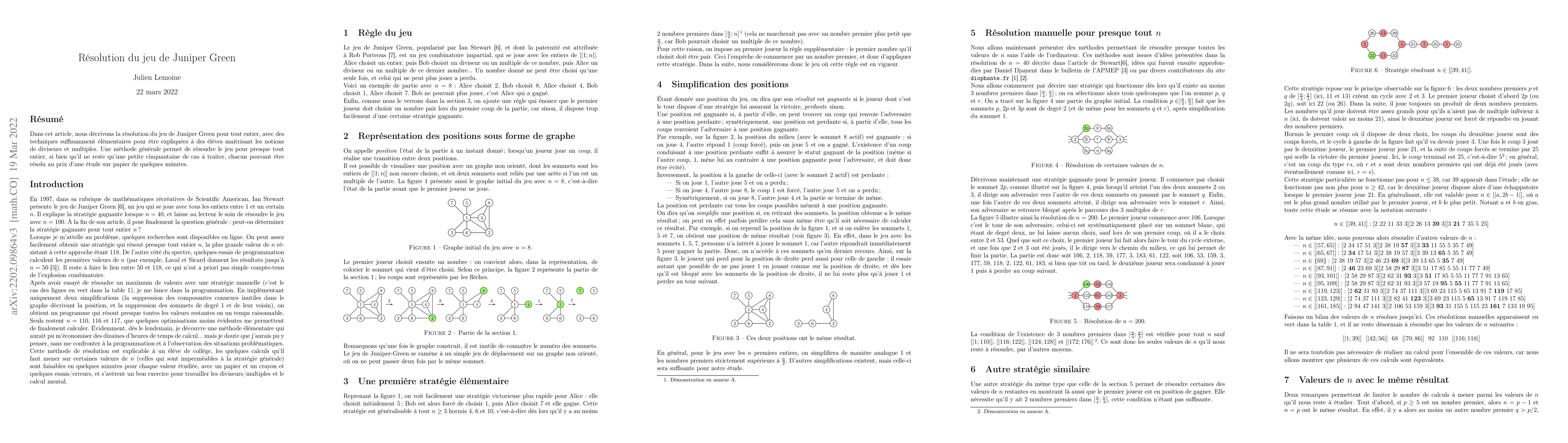 In this article, we describe the solution of the Juniper Green game for every integer, with techniques that are elementary enough to be explained to students who have mastered the notions of divisors and multiples. A general method allows us to solve the game for almost every integer, then there are less than fifty cases left to deal with. Each of these cases can be solved within a few minutes, with a paper and a pencil. -- Dans cet article, nous d\'ecrivons la r\'esolution du jeu de Juniper Green pour tout entier, avec des techniques suffisamment \'el\'ementaires pour \^etre expliqu\'ees \`a des \'el\`eves ma\^itrisant les notions de diviseurs et multiples. Une m\'ethode g\'en\'erale permet de r\'esoudre le jeu pour presque tout entier, si bien qu'il reste alors moins de cinquante cas \`a traiter, chacun pouvant \^etre r\'esolu au prix d'une \'etude sur papier de quelques minutes.