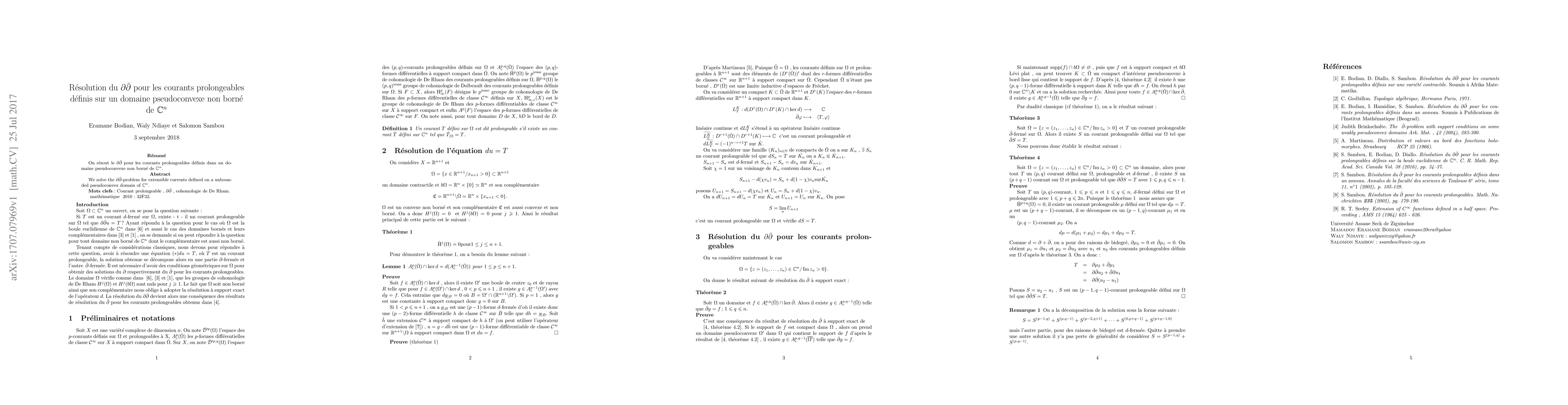 In this present paper, we solve the $\partial\bar{\partial}$ for extendable currents definite in a pseudoconvexe unbounded domain of $\mathbb{C}^n$ .