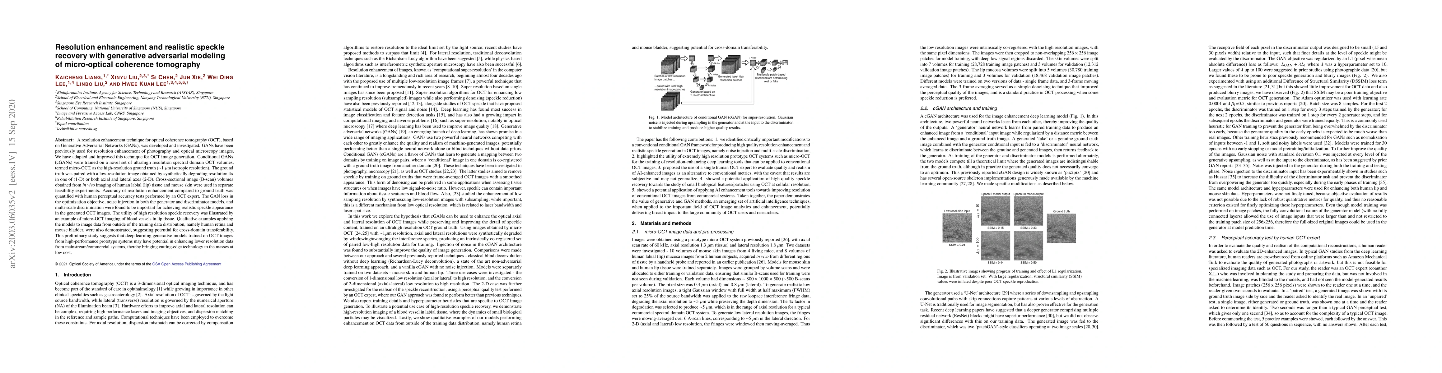 This paper presents a resolution enhancement technique for optical coherence tomography (OCT) using Generative Adversarial Networks (GANs) to improve micro-OCT image quality. The study demonstrates the potential of GANs to upscale low-resolution OCT images to near-isotropic 1µm resolution, showing promising results in imaging human labial tissue and mouse skin.