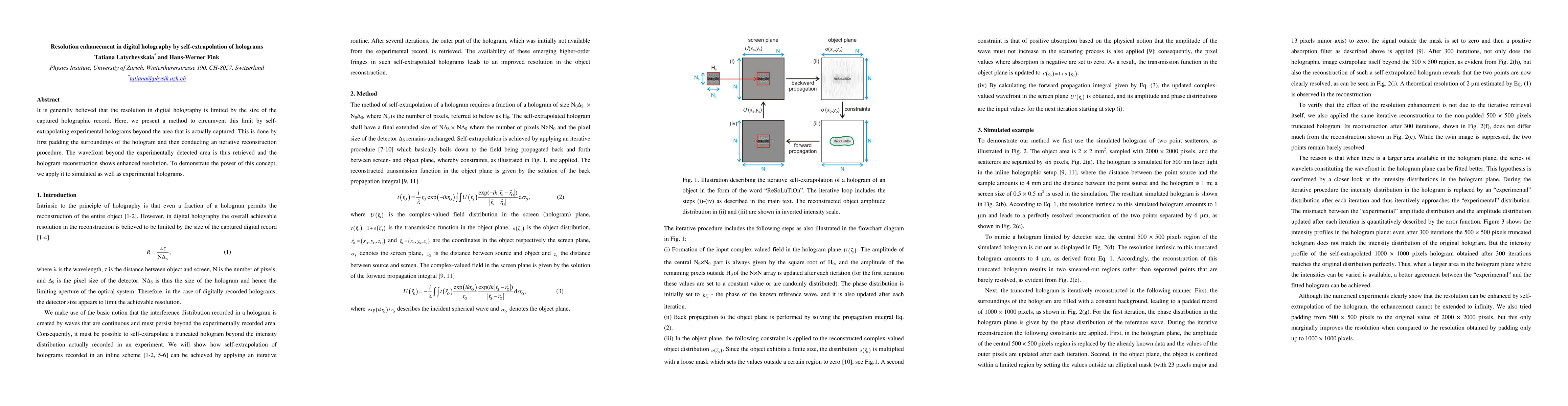 It is generally believed that the resolution in digital holography is limited by the size of the captured holographic record. Here, we present a method to circumvent this limit by self-extrapolating experimental holograms beyond the area that is actually captured. This is done by first padding the surroundings of the hologram and then conducting an iterative reconstruction procedure. The wavefront beyond the experimentally detected area is thus retrieved and the hologram reconstruction shows enhanced resolution. To demonstrate the power of this concept, we apply it to simulated as well as experimental holograms.