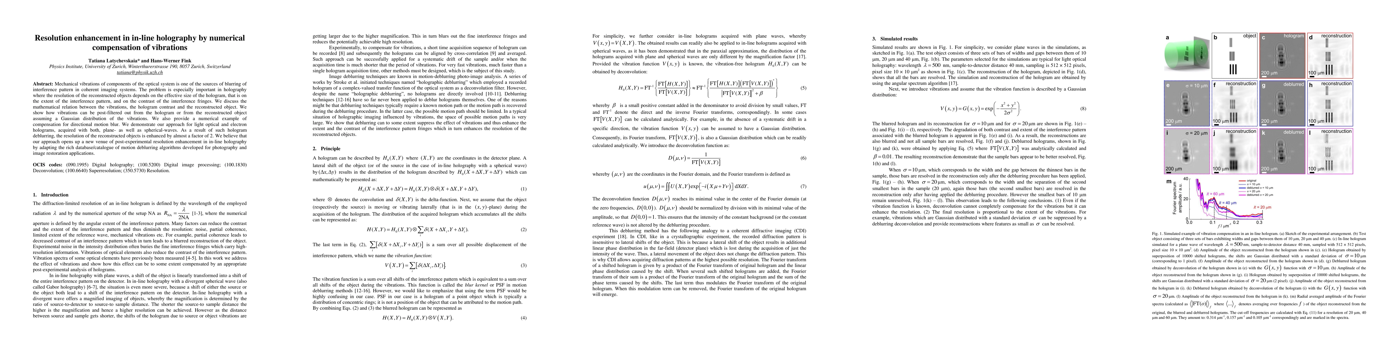 This paper proposes a method for enhancing resolution in in-line holography by numerically compensating for mechanical vibrations that blur the interference pattern. The authors demonstrate a post-experimental deblurring technique that effectively doubles the resolution of reconstructed objects, applicable to both light and electron holograms.