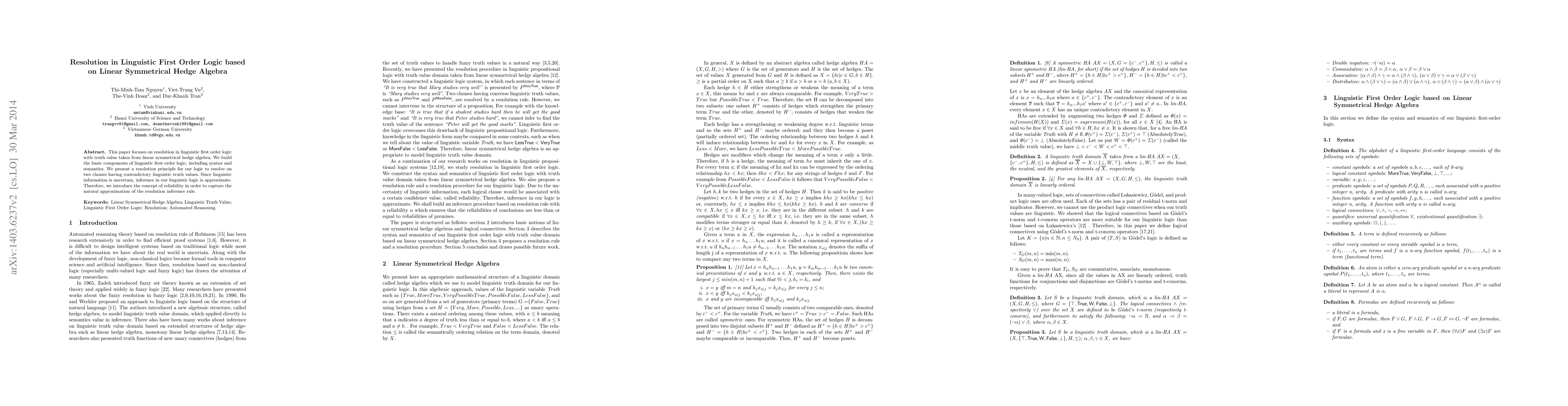 This paper develops a resolution principle for linguistic first order logic using linear symmetrical hedge algebra, focusing on managing uncertainty through a reliability measure to capture approximate inference. The resolution method addresses contradictory linguistic truth values effectively.