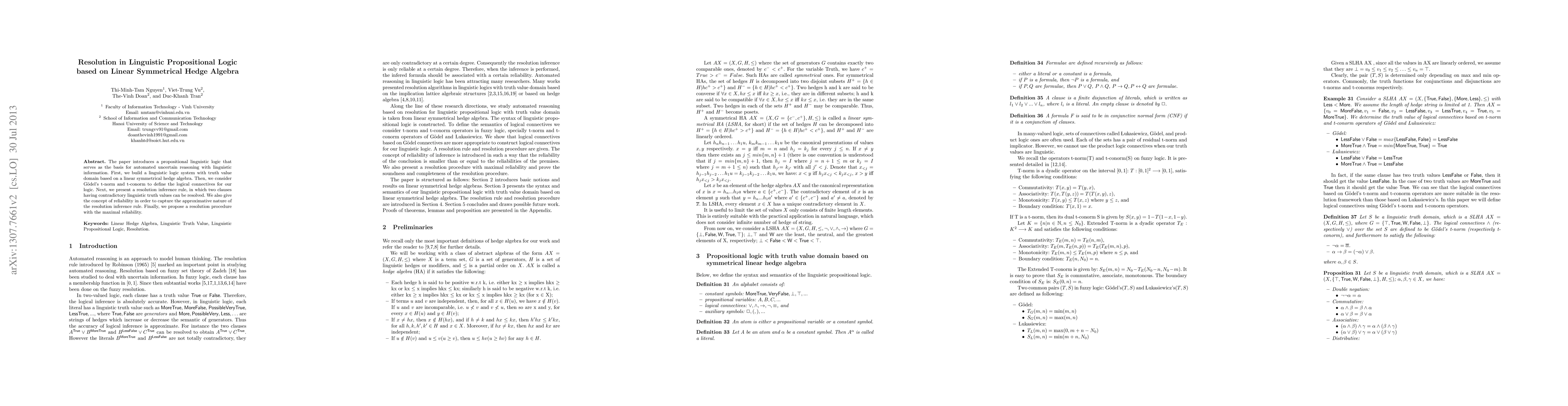 The paper develops a propositional linguistic logic system based on linear symmetrical hedge algebra, incorporating G\"{o}del's t-norm and t-conorm to define logical connectives, and presents a resolution inference rule for contradictory linguistic truth values, emphasizing reliability and maximal reliability in the resolution procedure.