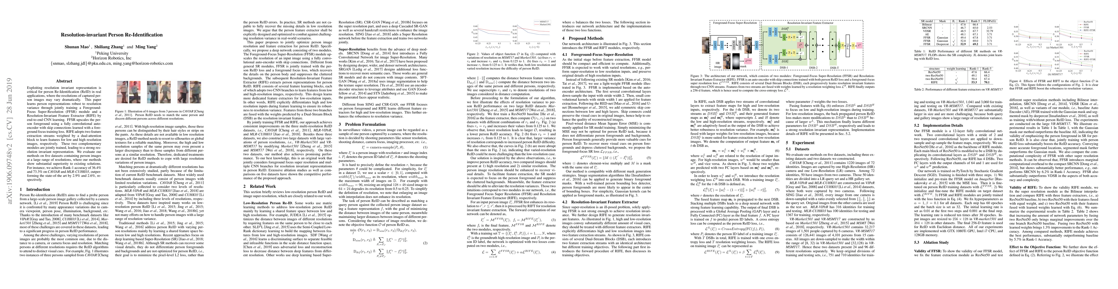 This paper proposes a method for person re-identification using resolution-invariant representations, combining a Foreground-Focus Super-Resolution module with a Resolution-Invariant Feature Extractor, achieving superior performance on multiple datasets. The approach outperforms existing solutions, notably by 2.9% and 2.6% on CAVIAR and MLR-CUHK03.