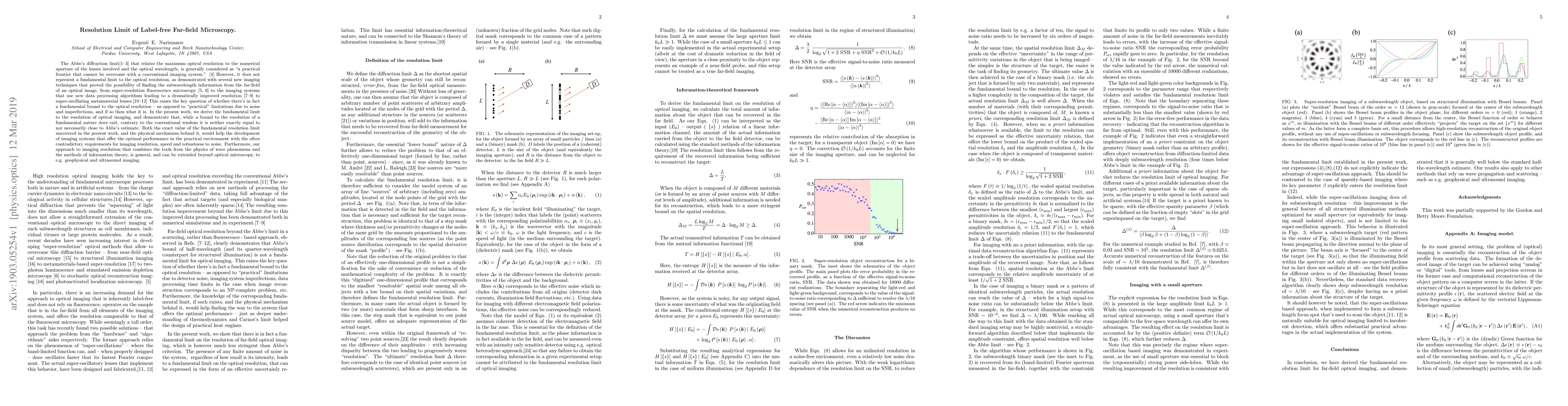 We derive the fundamental limit to the resolution of far-field optical imaging, and demonstrate that, while a bound to the resolution of a fundamental nature does exit, contrary to the conventional wisdom it is neither exactly equal to nor necessarily close to Abbe's estimate. Our approach to imaging resolution that combines the tools from the physics of wave phenomena and the methods of information theory, is general, and can be extended beyond optical microscopy, to e.g. geophysical and ultrasound imaging.
