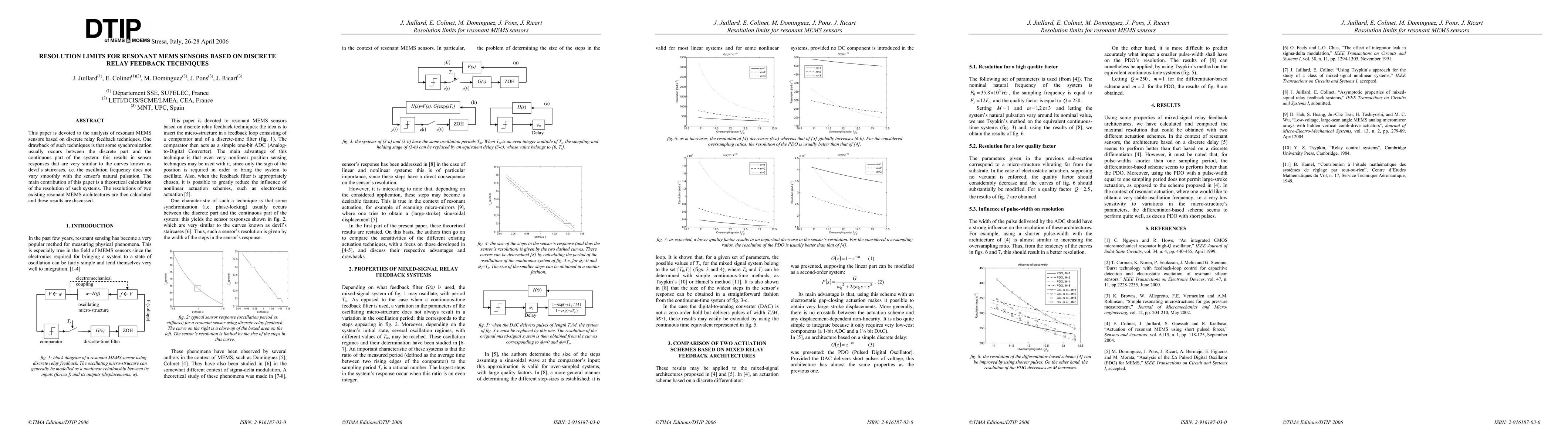 This paper analyzes resonant MEMS sensors utilizing discrete relay feedback techniques, identifying synchronization issues leading to non-smooth frequency responses. It provides a theoretical calculation of the resolution limits for these systems and evaluates the resolutions of two existing architectures.