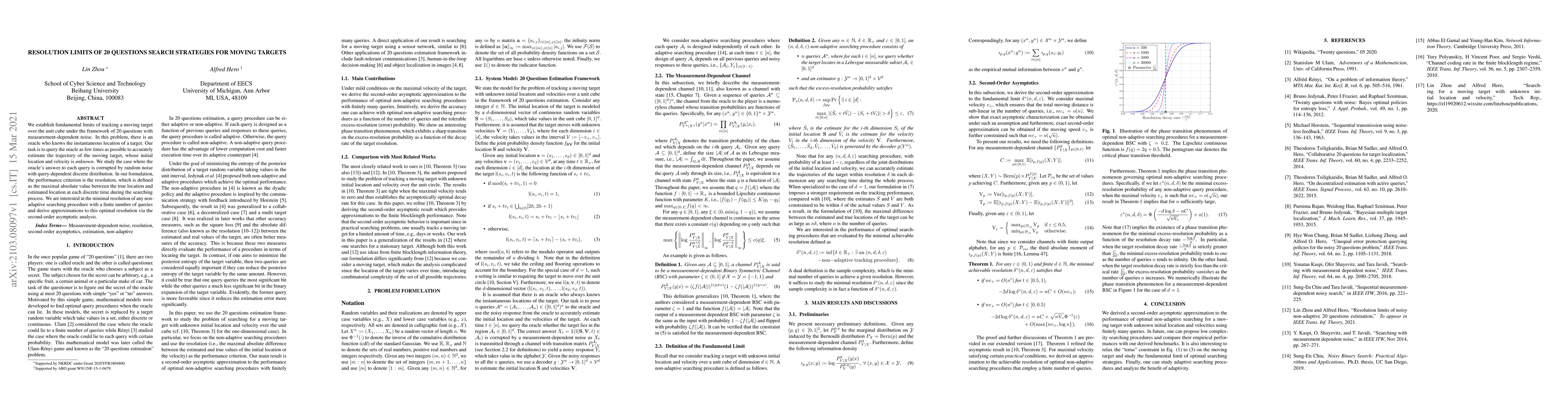 This research paper sets fundamental limits on tracking a moving target within a unit cube using a '20 questions' strategy, where each query to an oracle (knowing the target's location) has noise dependent on the query. The study defines 'resolution' as the maximum absolute difference between true and estimated target positions at each time step, aiming to minimize this for finite queries. The paper uses asymptotic analysis to approximate the optimal resolution for non-adaptive search procedures.