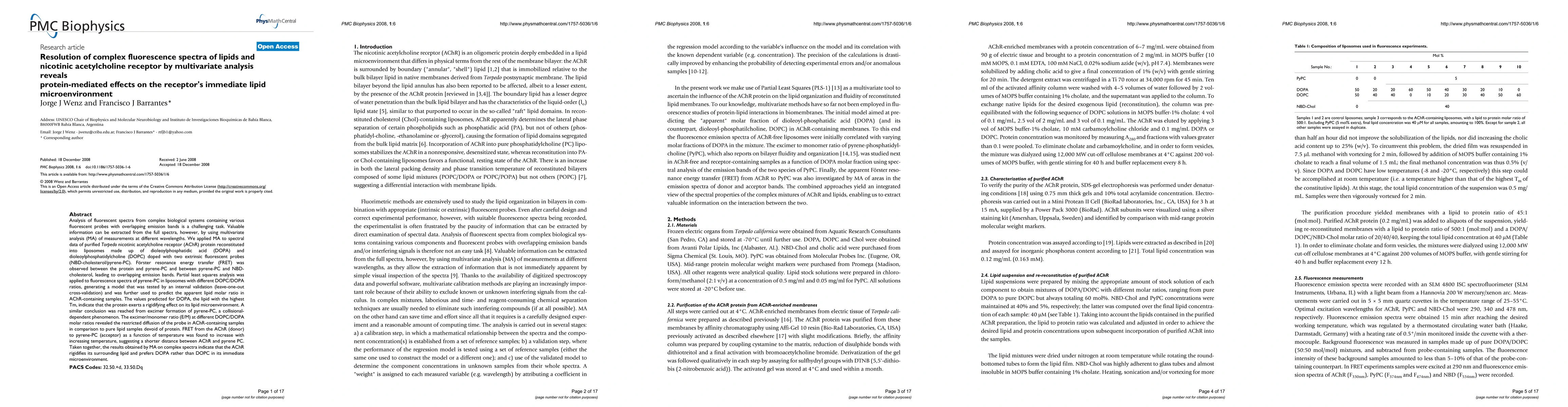 Analysis of fluorescent spectra from complex biological systems containing various fluorescent probes with overlapping emission bands is a challenging task. Valuable information can be extracted from the full spectra, however, by using multivariate analysis (MA) of measurements at different wavelengths. We applied MA to spectral data of purified Torpedo nicotinic acetylcholine receptor (AChR) protein reconstituted into liposomes made up of dioleoylphosphatidic acid (DOPA) and dioleoylphosphatidylcholine (DOPC) doped with two extrinsic fluorescent probes (NBD-cholesterol/pyrene-PC). Forster resonance energy transfer (FRET) was observed between the protein and pyrene-PC and between pyrene-PC and NBD-cholesterol, leading to overlapping emission bands. Partial least squares analysis was applied to ...